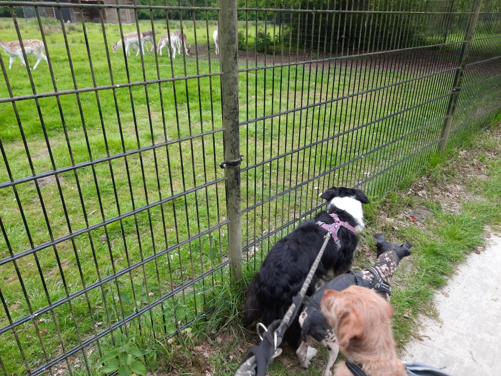 We hebben vanavond gewandeld in de Nienoord. We hebben uitgebreid gekeken bij de herten en de pauwen en hebben vervolgens nog een mooi stukje gelopen. Als we over smalle paden gaan moeten de lopende honden achter mij. Amy heeft daar dus niet altijd zin in (in verband met standje zo snel mogelijk naar het losloopterrein) en dan zeg ik tegen haar: Achter de buggy! En als ik dat doe, moppert er in de buggy eentje van bovenaf even mee. Hilarisch maar niet wenselijk natuurlijk.