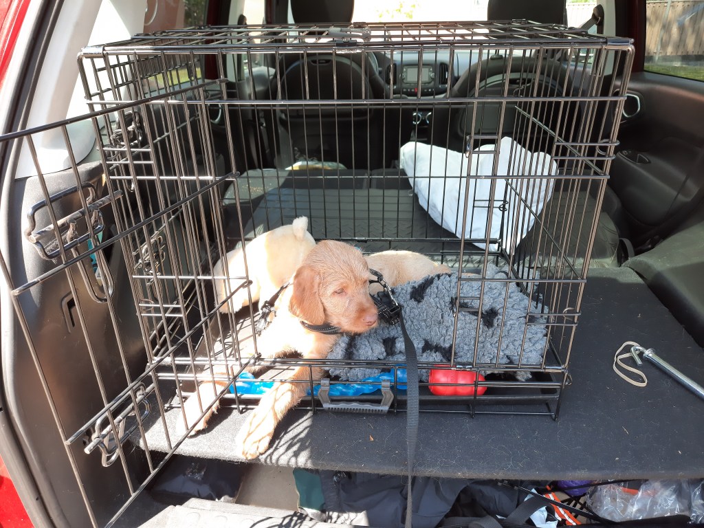 Vandaag moest ik twee keer met de auto weg om aangekocht meubilair op te halen. Pippa maar mee want als het onverhoopt uitloopt wil ik geen zorgen hebben over haar. Ze gedraagt zich nu in de auto echt voorbeeldig. Wel steken er steeds meer onderdelen uit de bench dus de grotere moet binnenkort de auto in.