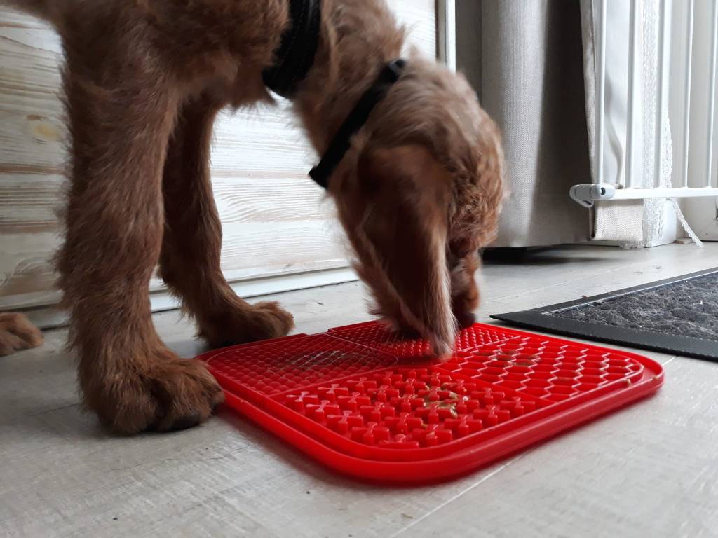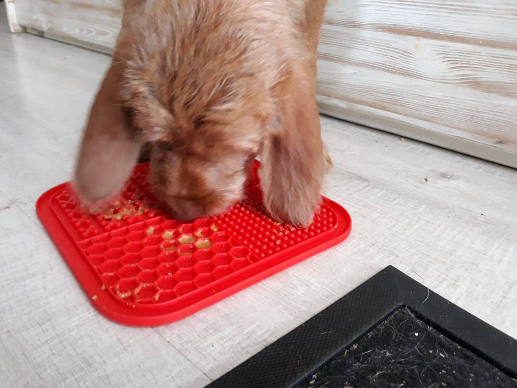 Dan na deze slaapronde operatie teek verwijderen uit het puppenoor. Gisteravond dat rotbeest al gespot maar probeer van een wriemelende pup het oor maar es een tijdje in je hand te houden. Bijtend kan ze nog bij je hand en je moet ook nog es een grote teek vrij werken uit het haar. Mission impossible. Geprobeerd af te leiden met wat brokjes en met een stukje gedroogde runderlong. Superstom want dan ruiken je handen nog lekker ook… Toen kreeg ik ineens de ingeving om om een likmatje te gebruiken. Op het matje een beetje pindakaas gesmeerd, matje op de vloer geplakt en in 1 beweging de teek uit Pippa d’r oor verwijderd. Tadaa.