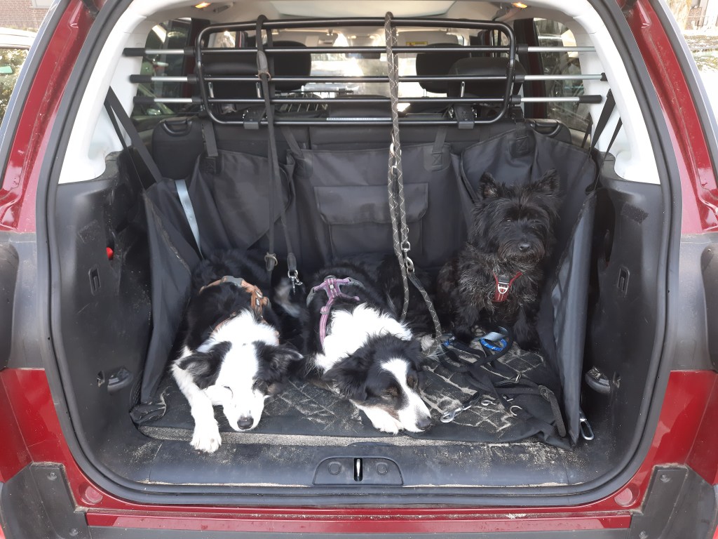 Op de terugweg had de Cairn zo’n mot met de BC’s dat ik bij een tankpauze de Cairn pontificaal op de buggytas op de voorstoel geparkeerd heb. Daar lag ie vervolgens languit te slapen. En dan weet ik ook direct de oorzaak van de ruzie achterin. Hij wil languit liggen en is door zijn verleden bij de vorige eigenaar bang dat de BC’s op hem gaan liggen. Hij grauwt dan-dat mag vervolgens niet van Amy die dan blaft-Noya zegt daar weer wat van… Zucht. Het wordt tijd dat de kennels weer in de auto komen. Morgen eerst maar een paar kilo zand verwijderen uit de auto.