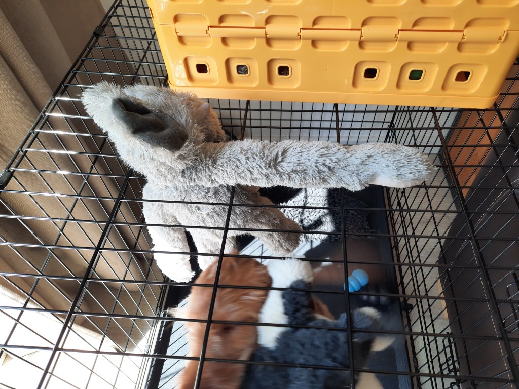 Deze vrijdag thuis aan het werk en terwijl ik op mijn thuiskantoor aan de slag ben, hoor ik wel een hoop kabaal in de bench beneden. Nu doet Pippa wel vaker gek met haar snackslang dus ik dacht echt dat ze daar nu ook weer mee bezig was. Kom ik na slaapje 2 beneden zie ik olifant shockingklem in de bench hangen. Die heeft ze dus geprobeerd naar binnen te halen. (Zodra ik Pippa uit de bench laat, gooi ik de slaapknuffel in het krat op de bench omdat de knuffel anders gebruikt wordt als trekspeeltje tussen 2 BC’s, vanmorgen heb ik het krat dus blijkbaar gemist.)