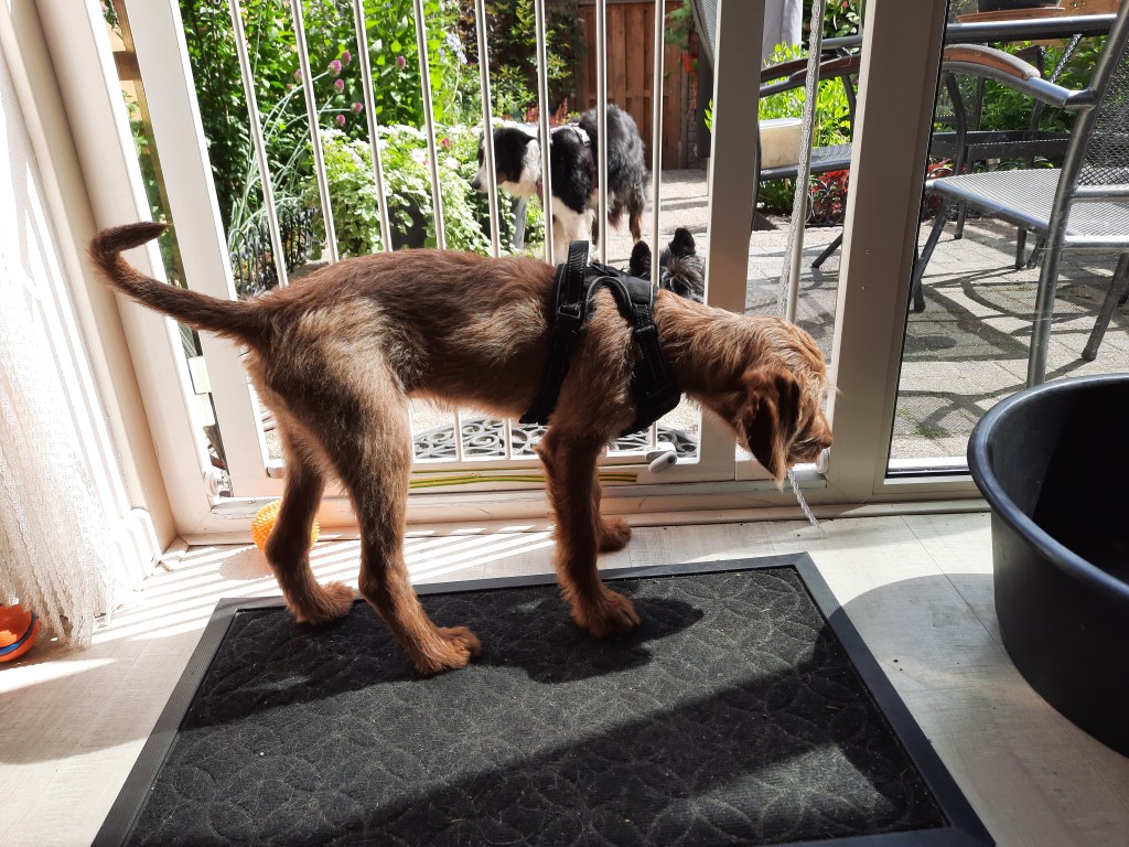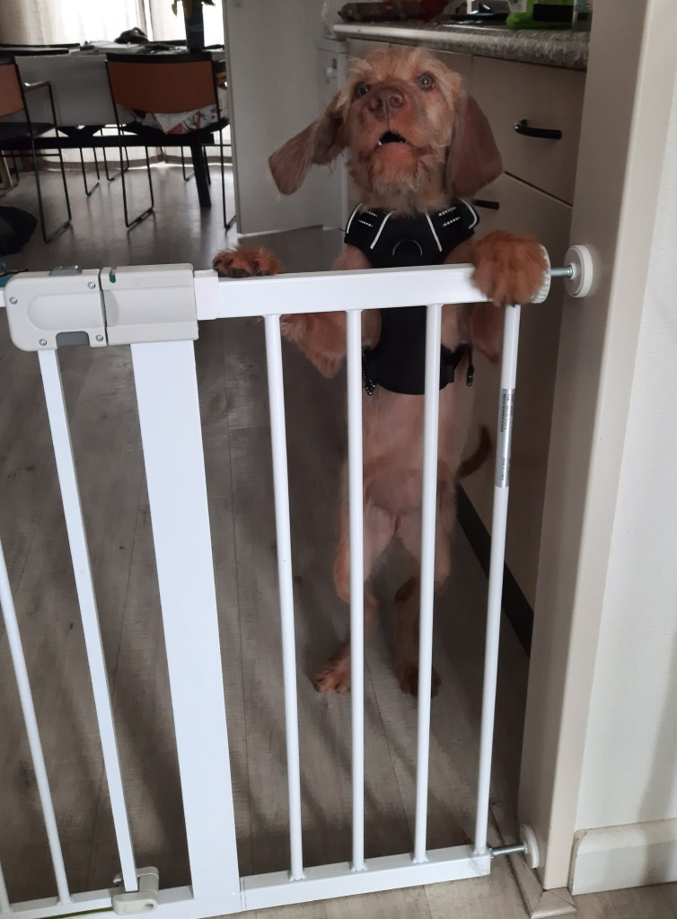 En dan merk je ineens dat je een grote hond in huis hebt/krijgt. Pippa kan met gemak met haar poten op het aanrecht en andere plekken waar je haar niet wilt hebben. Als je tegenwoordig zit te eten komt ze er gewoon naast staan om op tafel te kijken…