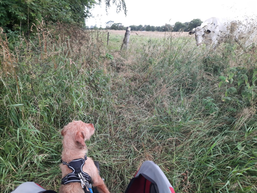 Vanavond teamwandeling in de Mensinghe. In het weiland aan het eind van het bospad, lopen altijd koeien. Pippa kreeg daar vanavond het volle zicht er op en was daar lichtelijk van onder de indruk.