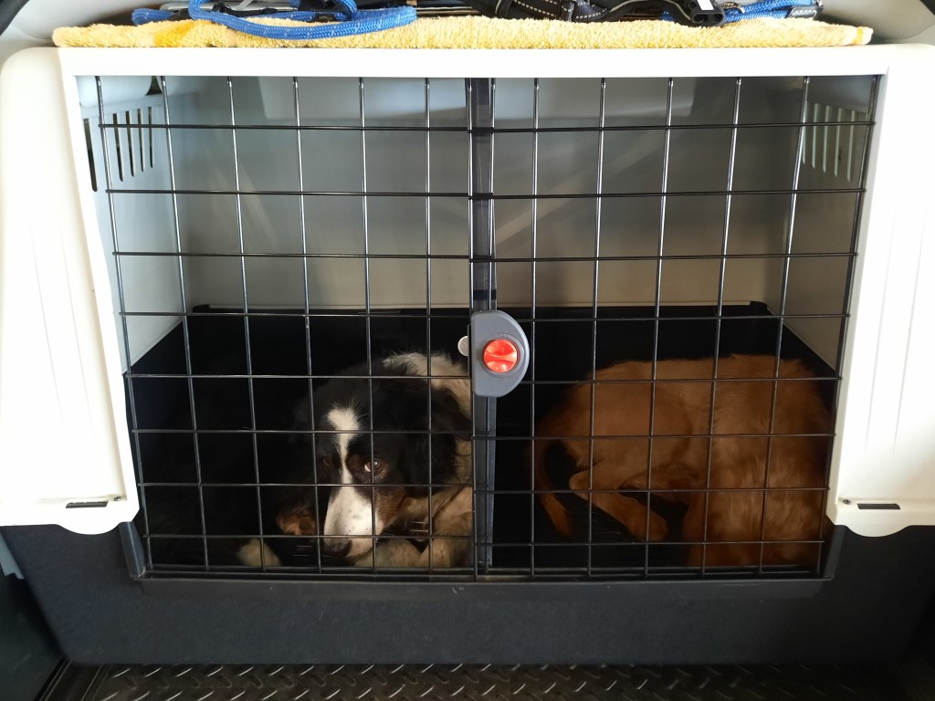 En dan rij je in de auto en hoor je het overdreven staartgebonk van Pippa ineens van de andere kant komen?! Ook begint Noya met een zachte buikgrom die aangeeft dat Pippa nú op moet houden met waar ze mee bezig is. Om te zien wat er in de achterklep gebeurt, de auto snel aan de kant gezet. Is het dolblije Pippa weer es gelukt om de plaat, die dient als tussenschot, te verwijderen en heeft ze plaats gewisseld met een sjaggo Noya. Beide honden zitten nu ook OP het tussenschot. Hoe??