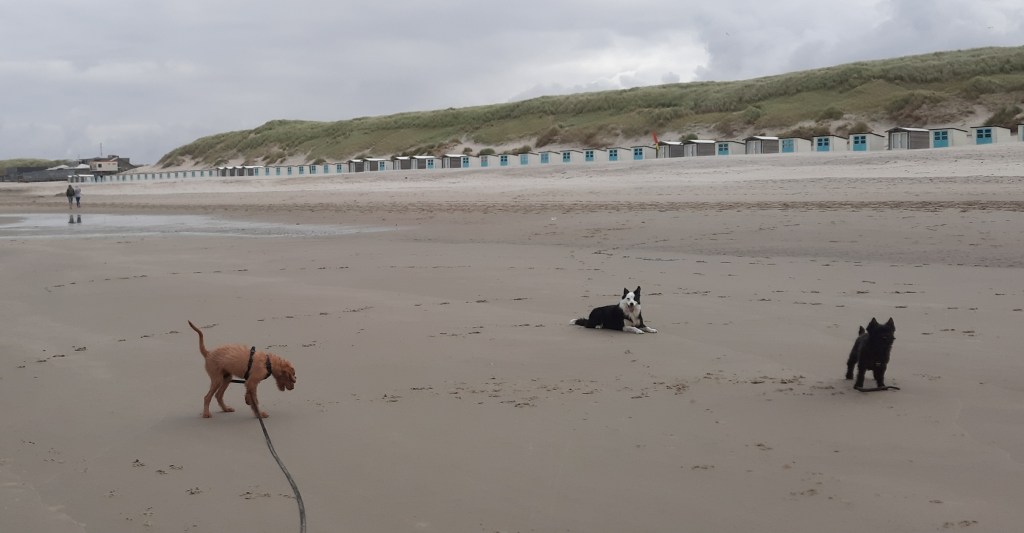 Na deze wandeling de auto in om de voorspelde bui af te wachten. Even naar de winkel gereden en me daar tijdens de regenbui vermaakt. Bovendien kunnen de honden ook wel een pauze gebruiken. Zodra de bui weer over was, zijn we naar het strand gereden bij de Sluftervallei. Heerlijk rustig op het strand en hier een ontspannen wandelingetje gemaakt. Pippa heeft even goed gekeken bij de oefening van de Reddingsbrigade. Zeer interessant om te zien hoe ze iemand uit het water halen en stabiliseren op het strand. En dan mag je daar niet eens met kop en oren bovenop staan van je bazin…