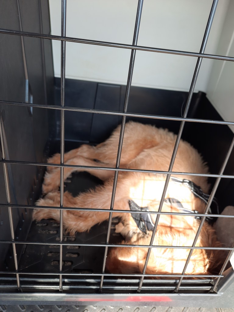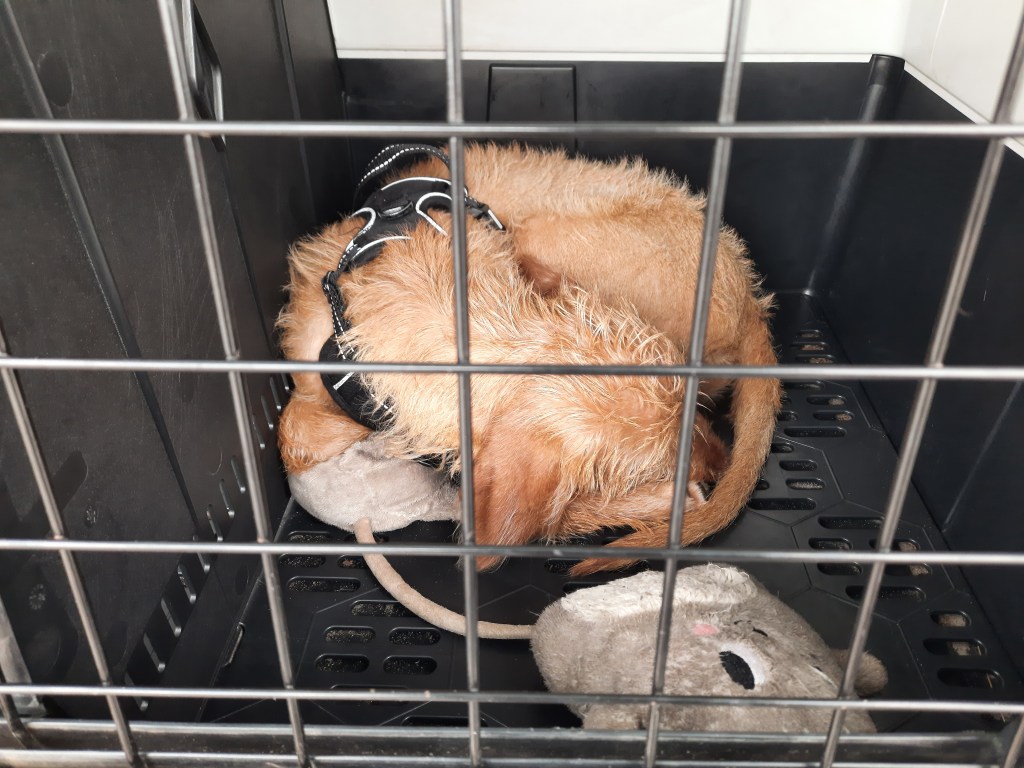 Alles weer inladen op de parkeerplaats en dan richting boot. Deze keer Pippa bij de bootparking even een plas laten doen zodat ze straks mee het dek op kan. Zo fijn dat ze dat plassen op commando nu echt overal wil doen. Vervolgens in de wachtrij de achterklep van de auto open gezet maar Pippa trok totaal geen aandacht van andere wachtenden: die lag prinsesheerlijk te slapen. Op de boot Pippa aangelijnd en de trappen op getild naar het buffetgedeelte draaideuren. Haar heel voorzichtig op de gladde vloer gezet en haar even laten rondkijken. De blij-ei-modus gaat gelijk aan bij het zien van zoveel mensen en met enige moeite heb ik een kop koffie bemachtigd. Plaatsgenomen op een drukke plek bij het raam en dan maar zien wat er gebeurt. Je ziet dat Pippa alles registreert (beweging boot, meevliegende meeuwen, lawaai) maar geen spoor van stress of angst vertoont. En maar in die kwispelmodus blijft naar werkelijk iedereen. Ben na deze gewenning maar gaan oefenen met zit en af tot het bijna tijd was om weer naar de auto te gaan. Wilde wel vóór de mensenmassa uit, de trappen weer af met bijna 11 kilo hond op de arm.