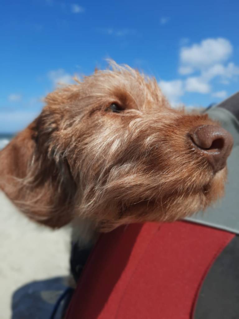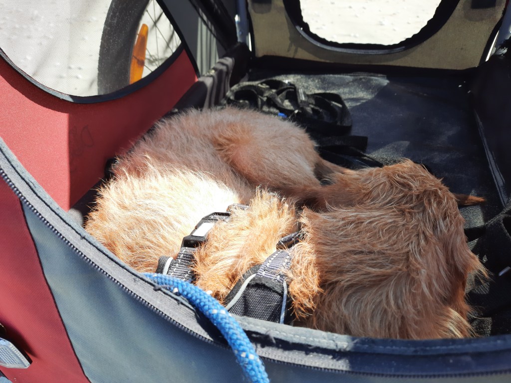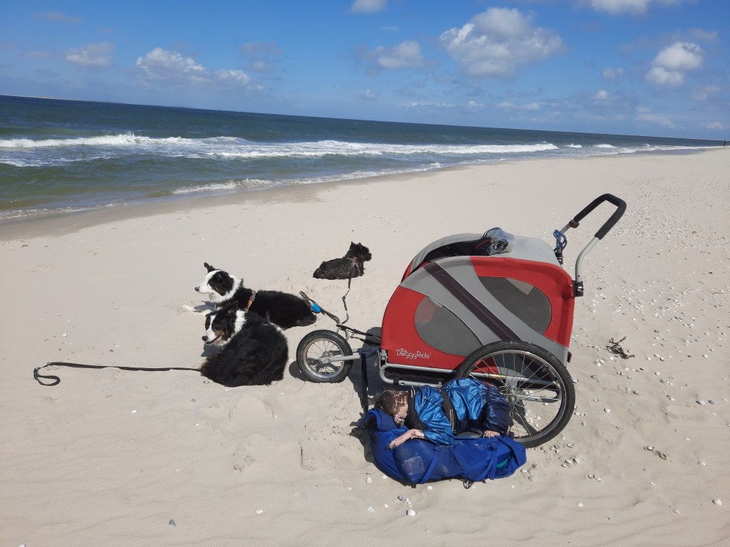 Na de lunchpauze vertrokken naar het strand bij de vuurtoren. Dit is doorgaans een redelijk rustig deel door de breedte van het strand en het zwemverbod door de sterke stroming daar. Pippa lag heerlijk te dommelen in de buggy en de rest van de teamleden ook op rust gezet. Darius was het dagje uit al zat en ik was zijn fleecedeken vergeten in de auto, dus hij alleen maar op mij liggen. Hem later de rugzak maar gegeven om op te liggen want het is nou niet het uitzicht waar ik op zit te wachten en steeds 11,5 kilo op je ribben is ook best zwaar. Het weer klaarde ontzettend op, het werd ineens erg zonnig en het strand stroomde vol met badgasten en wandelaars. Van geen enkele hond last gehad deze keer; heerlijk rustig op het strand gezeten. Dit was echt genieten.