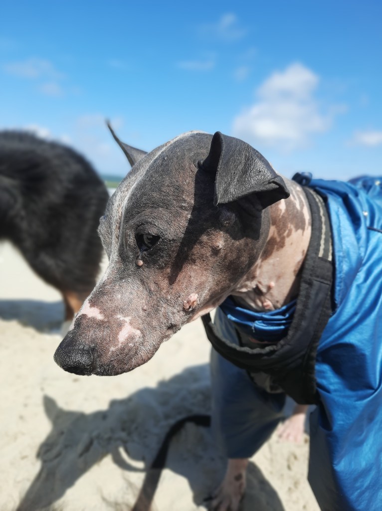 Vanaf de boot gelijk naar het strand bij Paal 17 gereden en de honden op het strand gelaten. Noya is in mineurstemming en rent niet met Amy en Rebel mee; blijft constant naast me en kijkt steeds naar me. Daar is duidelijk wat mee aan de hand maar praten kan ze helaas niet. Bij Darius zag ik vanmorgen dat de plek waar de wrat zat nu inmiddels glazig wit is… Opgelost door hem een jasje aan te doen en die komt dus voorlopig niet meer uit. In de wond maar geen zonnebrandcrème en of zand. Hij is duidelijk wel een stuk levendiger door de medicatie.