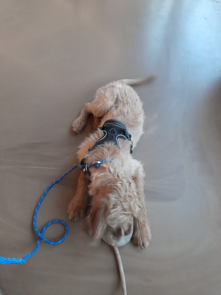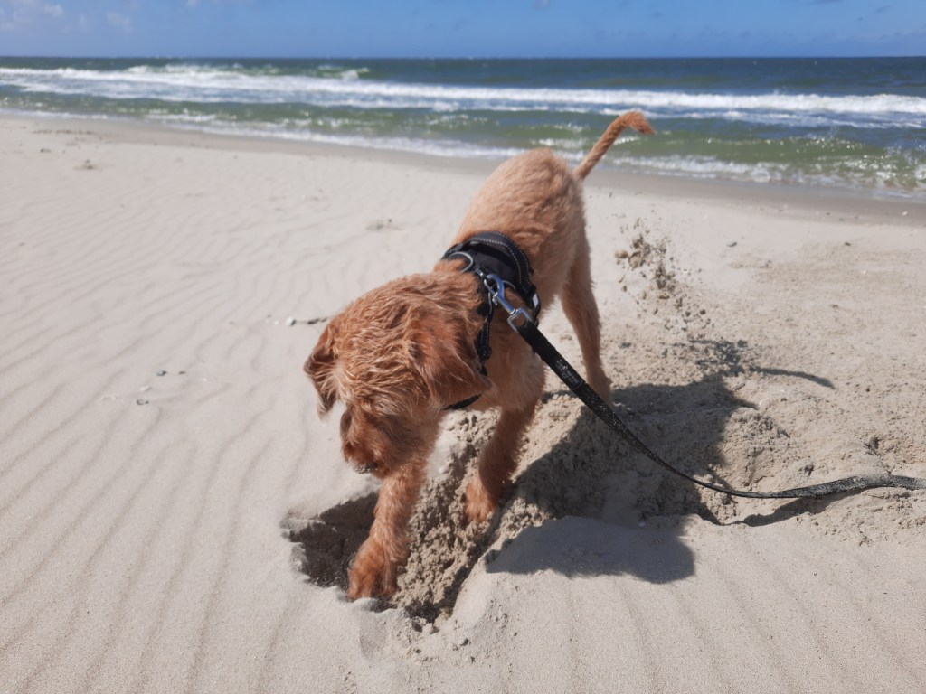 Pippa aan de lange speurlijn haar weekminuten laten lopen. Ze valt Amy constant lastig door als haar schaduw te fungeren en tegen haar aan te botsen. Amy laat mij dit oplossen door een rondje om de buggy te lopen zodat Pippa daar wel vastdraait met haar lijn… Het wordt dus hoog tijd dat Amy haar eens te kennen geeft met een snauw/grauw dat Pippa moet dimmen. De zee in lopen heeft geen enkel effect meer om Pippa kwijt te raken want wat Amy kan, durft en kan zij ook gewoon.