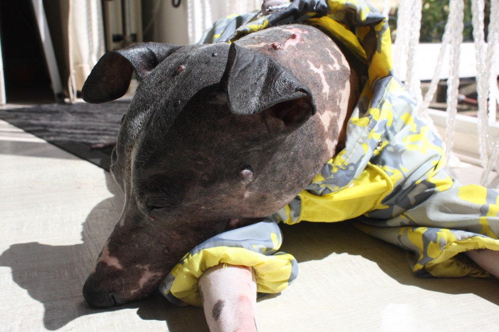 ’s Morgens nog een beetje gewerkt en daarna de tijd genomen om bij hem te zitten. Meneer wilde graag zonnen in de tuin en vandaag mocht ie dat zonder zonnebrandcreme of een jasje. Volledig gestrekt op het kussen op het terras en later ook nog bij mij op schoot. Hij ging zelfs nog even op zijn rug liggen zonnen en dat heb ik hem ook al maanden niet meer zien doen. Ook niet in huis geplast vandaag… Geprobeerd om Pippa wat langer wakker te houden na haar lunch, zodat ze slaapt terwijl ik van huis ben. Het is namelijk te warm om haar in de auto te laten. Helaas is mevrouw al twee dagen in een actieve blafmodus en ik hoop maar dat de buren niet al te veel last van haar hebben.