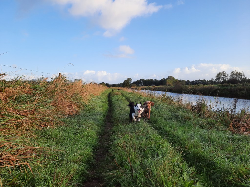 Dan uit het bos over het pad langs het diep. Bekende zwarte labrador met zijn eigenaren getroffen. Borders vooruit gestuurd en Rebel en Pippa naast me op zit gezet omdat het best een smal pad is voor zo’n grote groep. Maar helaas: meneer begint een heel verhaal tegen Pippa en die moet degene die deze lieve woorden zegt uiteraard uitzinnig begroeten. Vindt zij dan – ik was er op bedacht en had de lijn kort. Nananana-momentje zonder woorden.