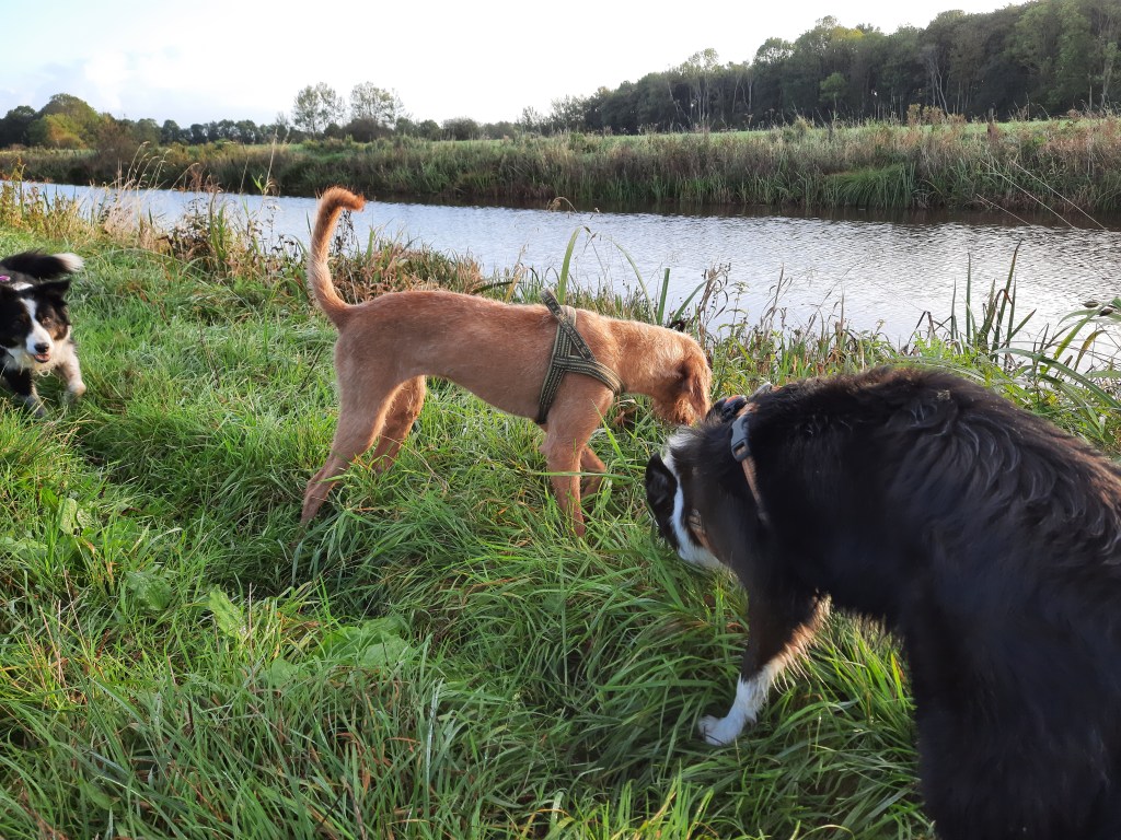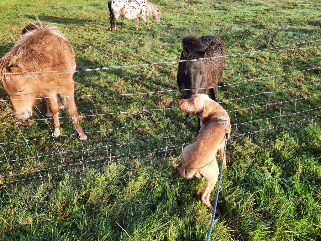 In de verte zie ik een mevrouw bezig met het gaas bij de pony’s en de paarden. Ze heeft een langharige Duitse Staander bij zich die besluit dat ie de weg zelf ook wel weet. Hij loopt ons tegemoet, terwijl mevrouw de pony’s aait, en gaat in het hoge gras op ons liggen wachten. Voor de tweede keer vandaag mist Amy een hond die ligt…Alle signalen van deze hond staan op oud en vriendelijk dus ik laat een tijdig aangelijnde Pippa even kort snuffelen en dan gaan we gezellig met een team van 5 honden richting de pony’s en de schapen. Mevrouw vervolgt met haar hond, haar weg weer en Pippa kijkt erg geïnteresseerd naar Rebel die contact maakt met de pony’s. Hij likt ze al kwispelend graag even over de snuit. Pippa besluit het ook es te proberen en laat zich helemaal afsnuffelen door een veulentje. Verder gelopen toen haar eerste verlegenheid verdween en ze besloot dat haar kop ook wel helemaal door het gaas kon. (Daar werkte mevrouw dus aan want de ruimte is hier wel erg groot.)