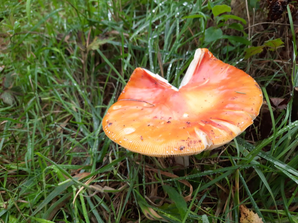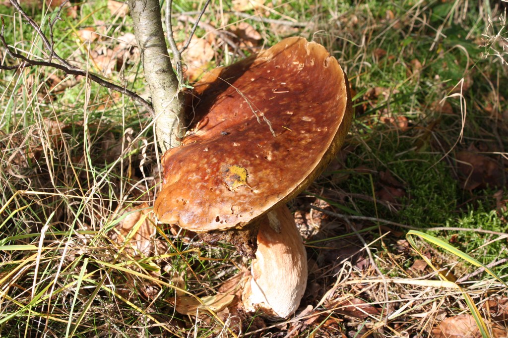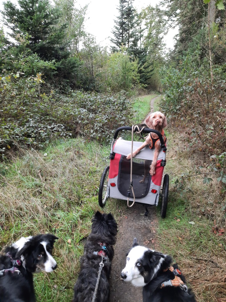 Dan heerlijk aan de wandel. Prachtige herfstkleuren en veel paddestoelen. Onderweg zie ik in de verte een manspersoon in de struiken staan langs het pad. Vlakbij zie ik dat het een oude man is die zijn fiets in de bosjes heeft geparkeerd om (naar later blijkt) te gaan wandelen. Maar Pippa ziet ineens iemand opdoemen en dat komt haar niet goed voor. Ze borstelt, gaat op haar achterpoten in de buggy staan en blaft keihard. De Borders en Cairn lopen stoïcijns door, maar zij gaat nog even door met blaffen. In mijn hoofd de tweestrijd want dit is wel heel fijn als je alleen op pad bent maar dit gedrag kan ik op de camping nou juist weer niet gebruiken. Split second de beslissing gemaakt om haar te benoemen dat het goed is + dankjewel. Ze hield gelukkig haar mond en bleef nog een tijdje geagiteerd (geborstelde rug). Maar even nadenken over een manier van hoe in de toekomst om te gaan met een waakse hond zonder dat die haar waaksheid verliest.