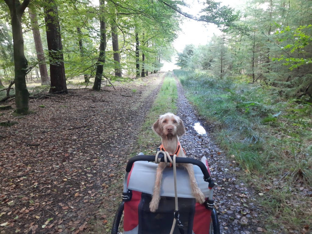 Op de parkeerplaats komt ons al een blije Golden Retriever tegemoet. Die wordt teruggeroepen met “Pippa hier” en daarop duurt het even twee tellen en gaat mijn Pippa in de autobox aan het blaffen. Vrij vertaald:: ik wil wel hier graag opvolgen maar mijn kenneldeur zit nog dicht! Mevrouw roept haar hond weer en mijn Pippa antwoordt weer op dezelfde manier. Ik vertel mevrouw dat ik ook een Pippa bij me heb en ze verteld mij weer dat ze hier vaak afspreekt met andere hondenbezitters en dat haar Pippa nu denkt dat ze een date met ons heeft. Ik ga verder met de buggy in elkaar zetten en mevrouw moet haar Pippa weer roepen omdat die steeds bijna hinderlijk met kop en oren in mijn buggy staat te kijken. Mijn Pippa begint nu helemaal als een dolle te blaffen en ik zeg: Pippa Klaar! Dit werkt voor de Golden, die aftaait naar zijn eigenaresse, en dit werkt voor de Vizsla die stil wordt.