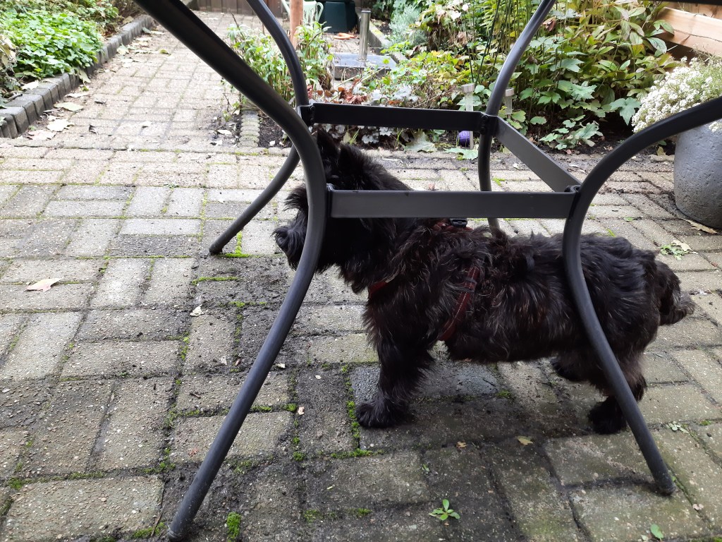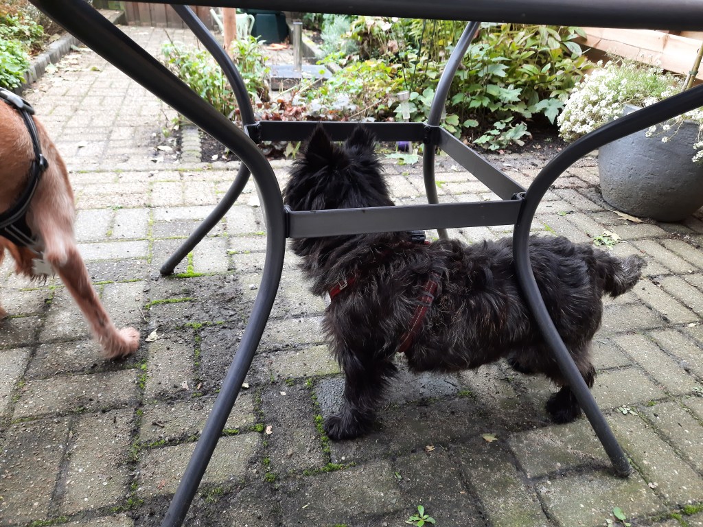 Als je onder de tuintafel staat ben je volledig beschermd tegen het poten-sla-spel van die Vizsla.