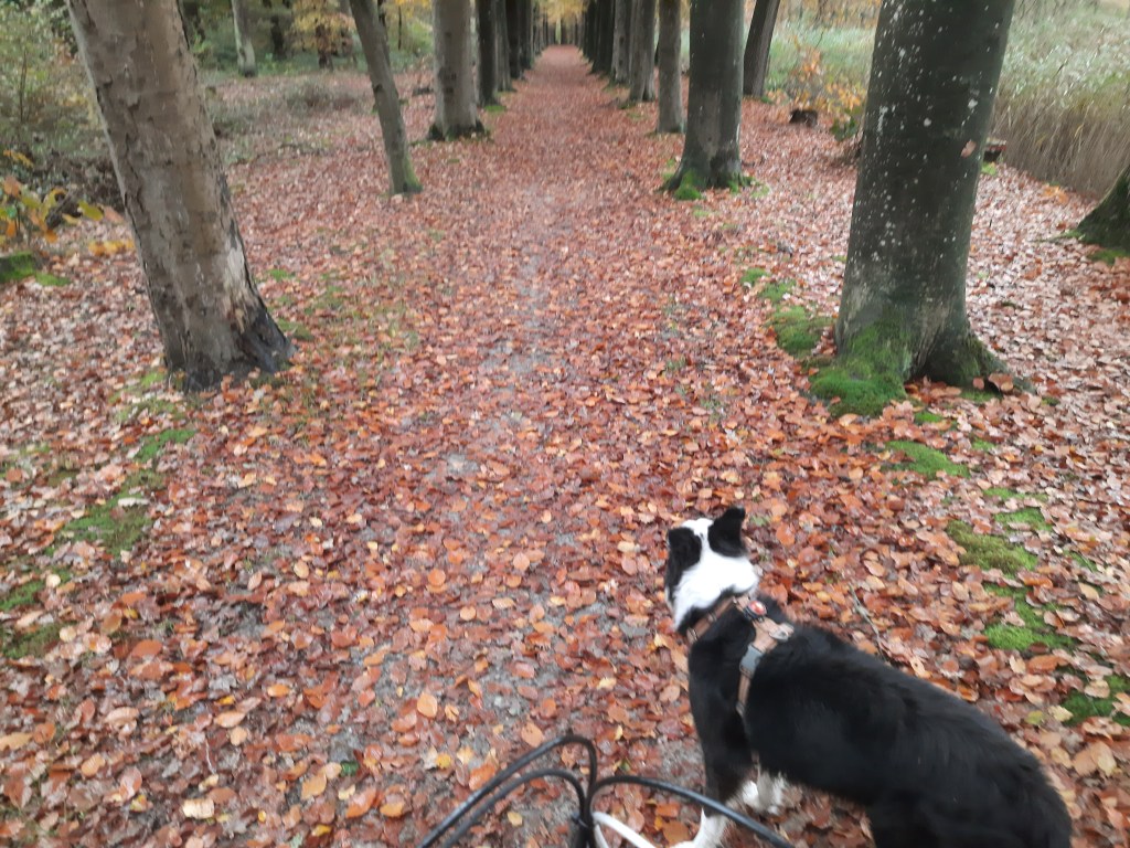 Amy vandaag weer zielsgelukkig gemaakt met een fietsrondje door het Nietapster bos. Mevrouw is weer in training voor een canicross-wedstrijd in december. Buiten de auto is ze al in wedstrijdmodus en er al twee keer vandoor voor ik mijn fiets van de auto gehaald heb. Dus maar aan de afsluitingsbalk van het bospad gekoppeld om te voorkomen dat ze zich blesseert met dat heen en weer racen met koude spieren. Uiteraard is ze er niet van gediend om vastgezet te worden dus jammeren en blaffen. Dan eindelijk het bos in en na een stukje warmlopen lekker racen.