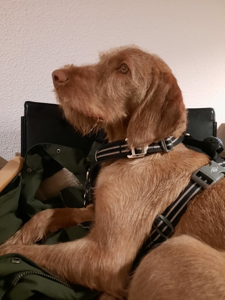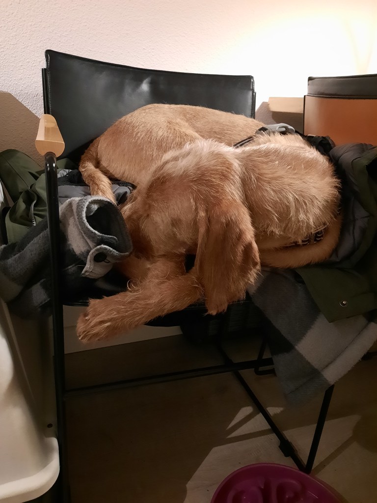 Na het wandelen kruipt ze op mijn net gedragen wandeljas die ik op een stoel gelegd heb. Vervolgens mijdt ze gewoon mijn blik en valt ze al kreunend en zuchtend in slaap.