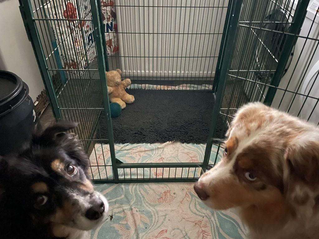 In verband met mijn aankomende operatie mocht Pippa vandaag even bij de oppas thuis kijken. Even snuffelen in de tuin voor Pippa en alvast de eigen gebruikte deken en speeltjes langsbrengen. Zelf eerst even alleen de honden van de oppas begroet en rondgekeken in de mooie grote tuin en daarna Pippa de tuin in gelaten. Die kwam daar gelijk uit de struiken met de verloren muts van de eigenaresse en vervolgens moest het speelgoed van de honden beproefd worden. Mijn pupsel gaat zich prima vermaken morgen. Maar hopen dat ze de Australian reu een beetje rust gunt.