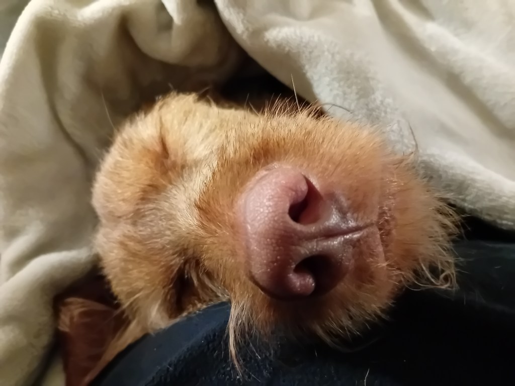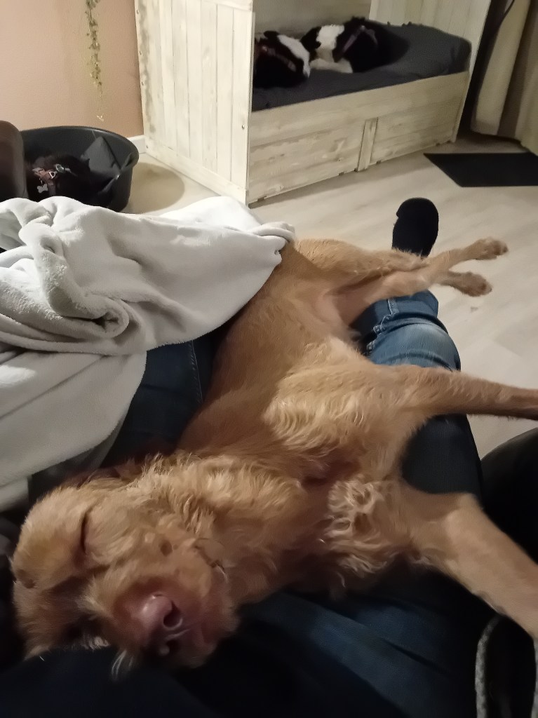 En dan wijst je jongste dochter je even fijntjes op de huidige gang van zaken in huis: Border Collies in de bedstee, Cairn in een plastic bakkie en Pippa op de stoel waarop bij aanschaf werd besloten, dat er beslist geen honden op zouden komen… Tja.