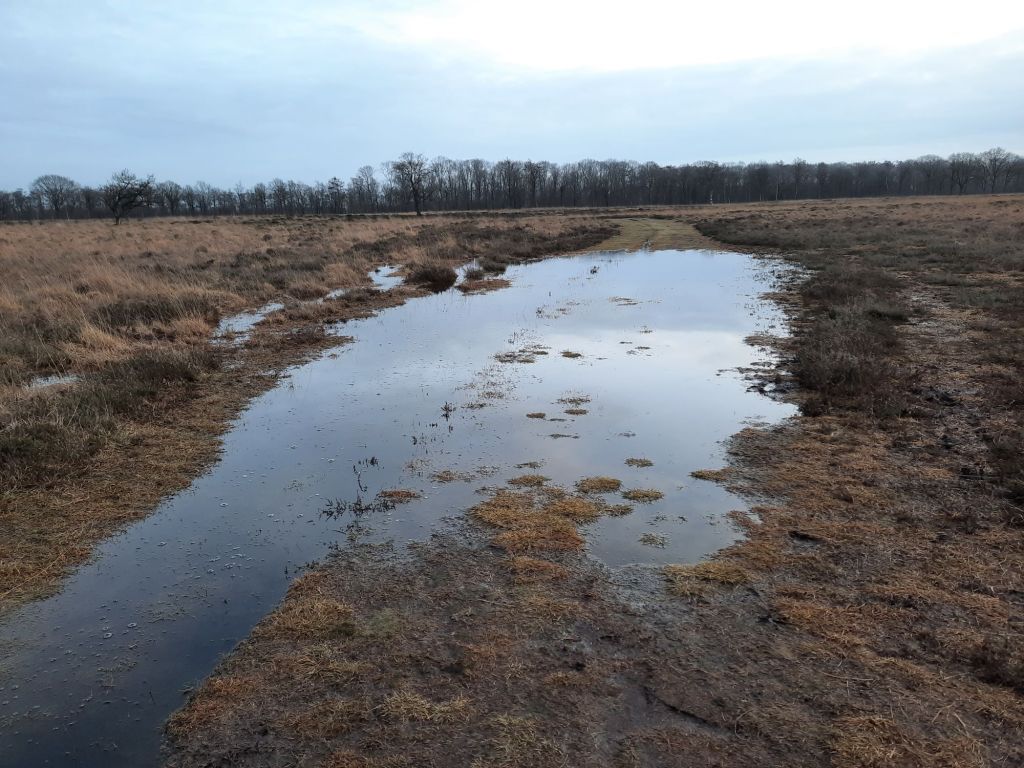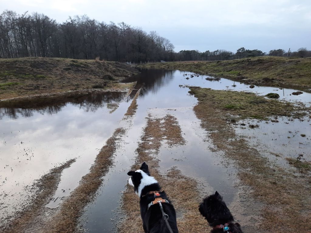 Veel water op het wandelpad en de laarzen kwamen goed van pas. Drie teamleden liepen bijna genietend door het water, arme Rebel heeft er een bloedhekel aan. Waar hij maar kon probeerde hij er om heen te lopen.