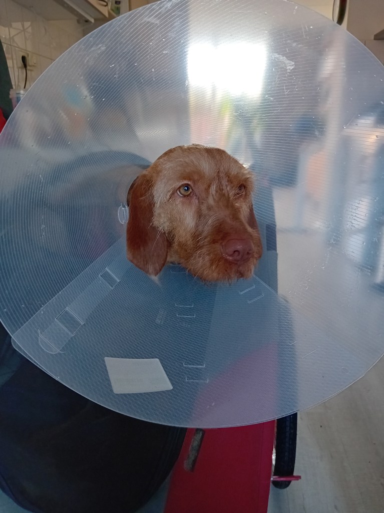 Daar bij de kliniek liep alles anders dan anders doordat er afspraken omgezet moesten worden door fileleed. Goh.. Maar met enige vertraging mogen wij dan de behandelkamer binnen waar het verband er af moet. Dat zit dus dermate vast dat Pippa aangeeft dat het verwijderen pijn doet. Het wordt wat meer nat gemaakt en dat helpt. Dat herhalen we een paar keer tot het verband er echt helemaal af is. Dat beeld is voor mij wel even schrikken maar er wordt mij verzekerd dat het er echt heel goed uit ziet. De kap moet nu om, om te voorkomen dat de hechtingen eruit geplukt worden. Het is best een gedoe om de enorme kap op maat te krijgen maar met enige hulp lukt het uiteindelijk. En dan mogen we weer aan de terugreis beginnen. Pippa vind het uiteraard maar zozo met dat ding om en knalt overal tegenaan. Ook is ze er van overtuigt dat ze niet meer in de kofferbak past en moet ze toch even overgehaald worden om die kop binnen de auto te steken. Tijdens het wegrijden moppert ze daar nog wat over maar uiteindelijk besluit ze toch maar om te gaan liggen. De terugreis verloopt gelukkig een stuk soepeler dan de heenreis.