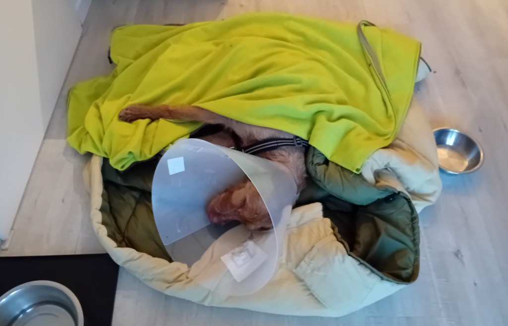 En dan hebben we vandaag toch een nare dag; de hele dag ligt Pippa compleet out. Daar kan ik dus niet zo goed tegen. Geen gekwispel en geen geknuffel maar gewoon voor dood in de dekens. De hele dag. Volgens mij is ze vandaag hooguit een half uur wakker geweest. Teamwandelingetjes zonder haar en volgens mij heeft ze niet eens door dat we eventjes weg zijn.