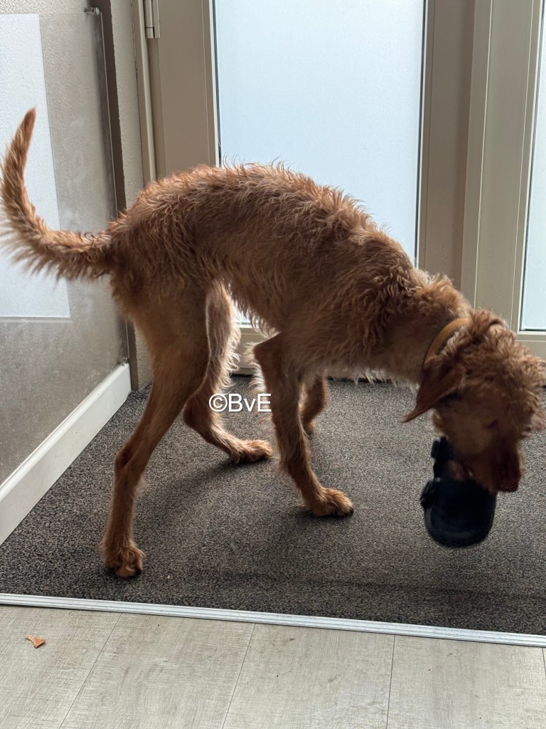 Na mijn middagpauze ben ik wel weer toe aan een slapie en ik doe dat dan ook braaf. Om een uur of vijf ben ik wel weer volledig bijgeslapen en mag ik weer uit de bench voor mijn avondprogramma. Dat is meestal gevuld met een lange wandeling, lekker spelen met de voedselvoorziening en als ik geluk heb met de andere teamleden. Helaas moet ik dan wel aan de riem omdat ik nog niet wild mag spelen van de chirurg. Na mijn avondeten moet ik zalf in mijn oren die we van de dierenarts gekregen hebben. Ze willen niet dat ik nog langer oorontsteking heb dus die zalf moet echt even. Voedselvoorziening zegt ook steeds: moet echt even als ze dat inspuit zodat ik weet dat ik er niet onderuit kom en beter maar in mijn hoekje kan blijven zitten tot ze klaar is met dat gedoe. Eigenlijk vind ik het best grappig om na mijn oormassage snel mijn kop te schudden maar tegenwoordig gaat de voedselvoorziening eerst staan voor ze mijn oren weer los laat. Best flauw, heb ik weer iets uitgevonden, doet ze dat..