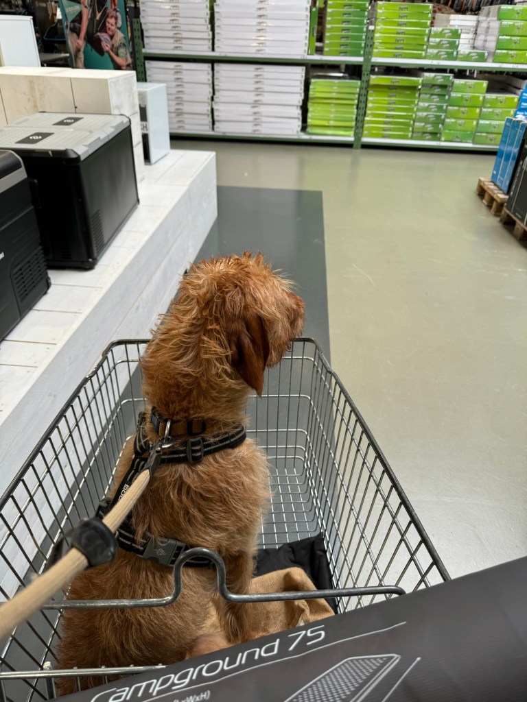 We komen samen weer een beetje onder de mensen nu Pippa meer mag met haar geopereerde poot. Vandaag haar weer es meegenomen naar de kampeerhal. Benchmat mee, want door de gladde vloer in de winkel moet ze wel in de winkelwagen. Zodra ik de winkelwagen pak en haar installeer komt een mevrouw Pippa knuffelen. Geen vraag of dit mag of zo, ze schreeuwt alleen naar haar man dat ie de hond uit de auto moet laten want honden mogen mee naar binnen. Wijzend op Pippa: kijk maar!! Lastig om weg te komen als iemand voor je winkelkarretje staat.