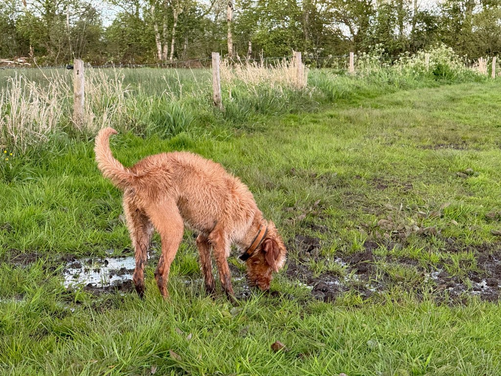 Aan het eind van het pad langs de sloot weer aan de lijn en weer beheerst samen verder. Alles lekker vies de auto in naar huis. Hele avond niet weer gezien 😉