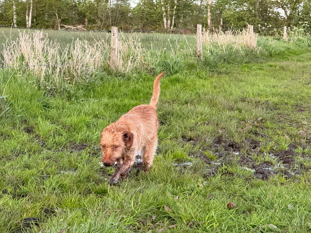 Na telefonisch overleg met Robin van Jachttraining, Pippa los gelaten tijdens de wandeling. Noya ook los en de rest aan de lijn om wild spelen te voorkomen. Ze startte op met rondjes draaien als een malle en ging daarna vol snelheid vooruit en na een modderpoelinspectie, op volle snelheid weer naar mij terug. Geen wilde stops maar beheerst racen (voor zover dat mogelijk is).