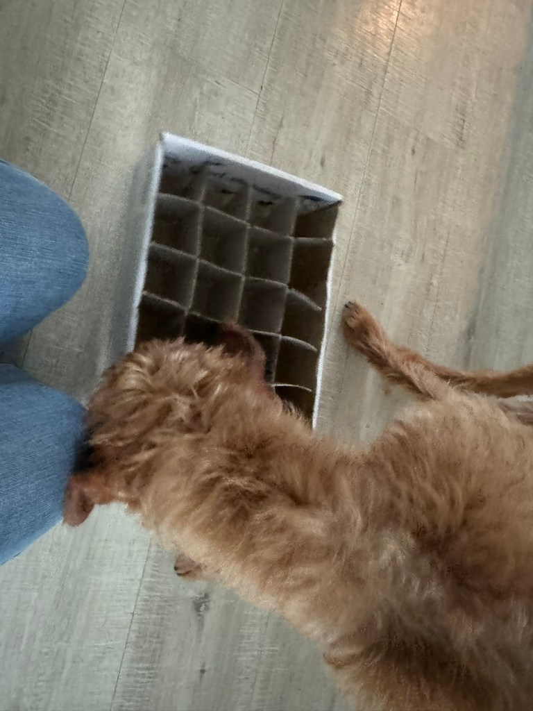 Met een verpakking van kleine jammetjes, met daar in wat brokjes vermaakt mevrouw zich prima: