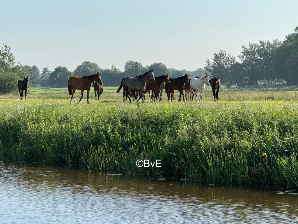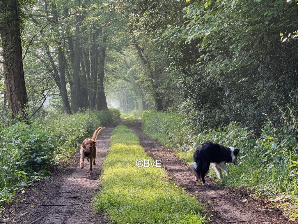 Lekker vroeg naar het bos vanmorgen: enorm genoten van de heerlijke rust. Pippa d’r kop staat in de ochtend niet zo naar donderjagen dus ook onder de honden rust en kalmte. Tijdens het wandelen roep ik haar meerdere keren terug en zonder uitzondering komt ze direct en gaat netjes bij mij zitten. Super tevreden over. We komen maar één andere persoon tegen en da’s de man die zijn paarden in het bos heeft staan. We treffen hem op een smal pad en hij is op de fiets vandaag. Ik leg direct drie honden op AF en Pippa zet ik op ZIT naast mij. Meneer geeft aan dat het handiger is dat hij zal wachten en ik stuur daarop drie honden vooruit. Amy rent er voorbij conform commando, Rebel volgt en Noya denkt bij meneer de ultieme grasspriet gevonden te hebben en blijft “hangen”. Hierop komt Rebel terug en gaat buurten bij meneer; irritant buurten bij meneer in de vorm van opspringen. Ik straf Rebel vocaal en zeg sorry tegen meneer. Die denkt dat ik sorry zeg voor mijn bulderende Foei! en begint een heel gesprek dat mijn aktie precies is zoals hij zo graag ziet. Sorry is niet nodig en zo werkt het met de paarden ook tenslotte. Praatje gemaakt en daarna verder gelopen.