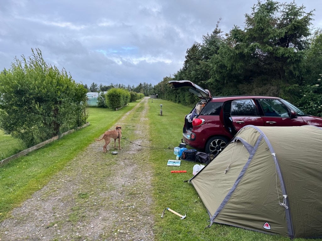 Eenzame plek gekozen zodat we zeker weten geen overlast bezorgen bij andere campinggasten. Eerste keer deze tent, deze samenstelling en morgen om 6 uur tent afbreken… Honden aan trekhaak geknoopt en tent opzetten. Fluitje van een cent en dan constateren dat de bench van Pippa nu een kapotte rits heeft. Het is.