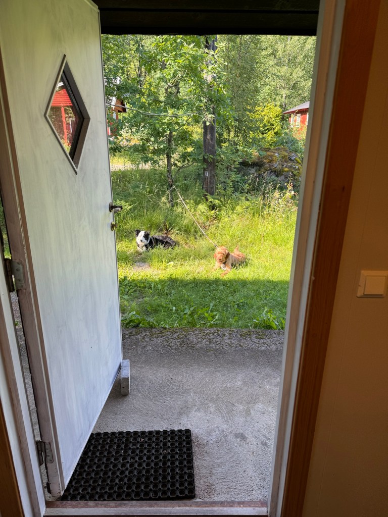 Mooi om te zien hoe Pippa gedrag van Amy kopieert. Pippa loopt nu ook over de plankjes maar moet nog beter op het neerzetten denken. Poot kan en gaat er soms tussen. In stromend water ga je staan drinken. Schapen op het pad moet je negeren, zeker als ze lammetjes bij zich hebben. Amy weet dat, maar Pippa vind een stampende ooi ontzettend interessant. Je ziet aan Amy d’r kop dat ze daar ongemakkelijk van wordt en ik sleur op Pippa maar zo snel mogelijk weer mee. Op het eindpunt een korte pauze genomen en dan weer terug naar de camping. Net genoeg tijd om te eten en dan auto in in verband met de zware regen en het onweer. Honden verder de hele middag laten slapen.