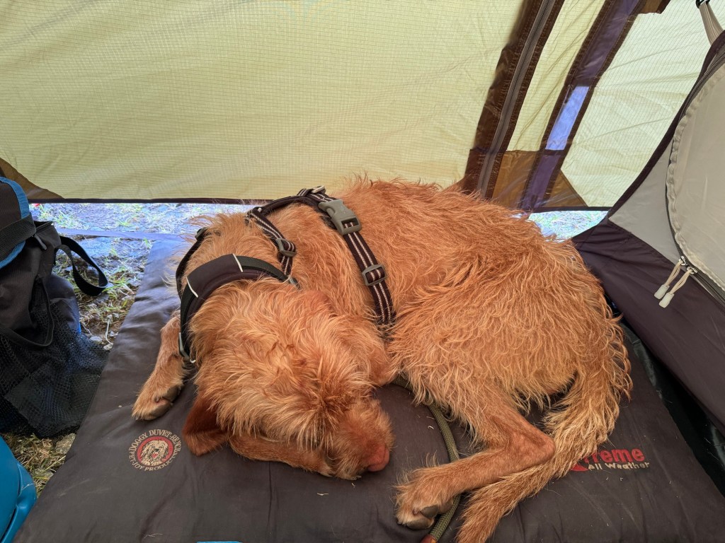 Honden konden vandaag bijslapen in de auto. Autorit van dik 5 uur inclusief een veerboot. Nu staan we op een camping in buurt van Loen waar onze Duitse buren een golden retriever hebben die Maggie heet. Het speelfeest op voorhand afgeserveerd onder mom van operatie en revalidatie. Soms schat je in dat je dat beter maar kunt zeggen… Toen ik zat te eten en Pippa aan mijn picknickbank geknoopt zat, kwam mevrouw Pippa even knuffelen. Ongevraagd en dan zeg ik niets. Na paar minuten zei ze dat er geen Uit-knop op zat en dat ze haar dan maar weer alleen liet. Ik zeg: Zit en Pippa gaat keurig zitten en blijft doodstil wachten. Hoezo geen uit-knop?