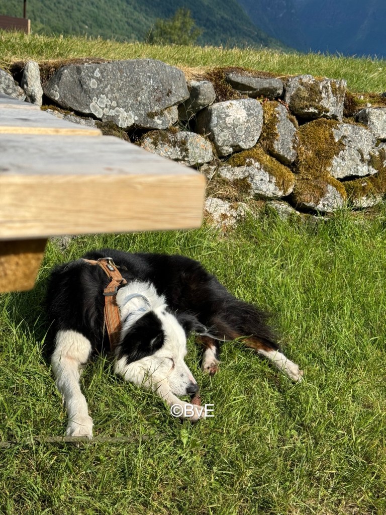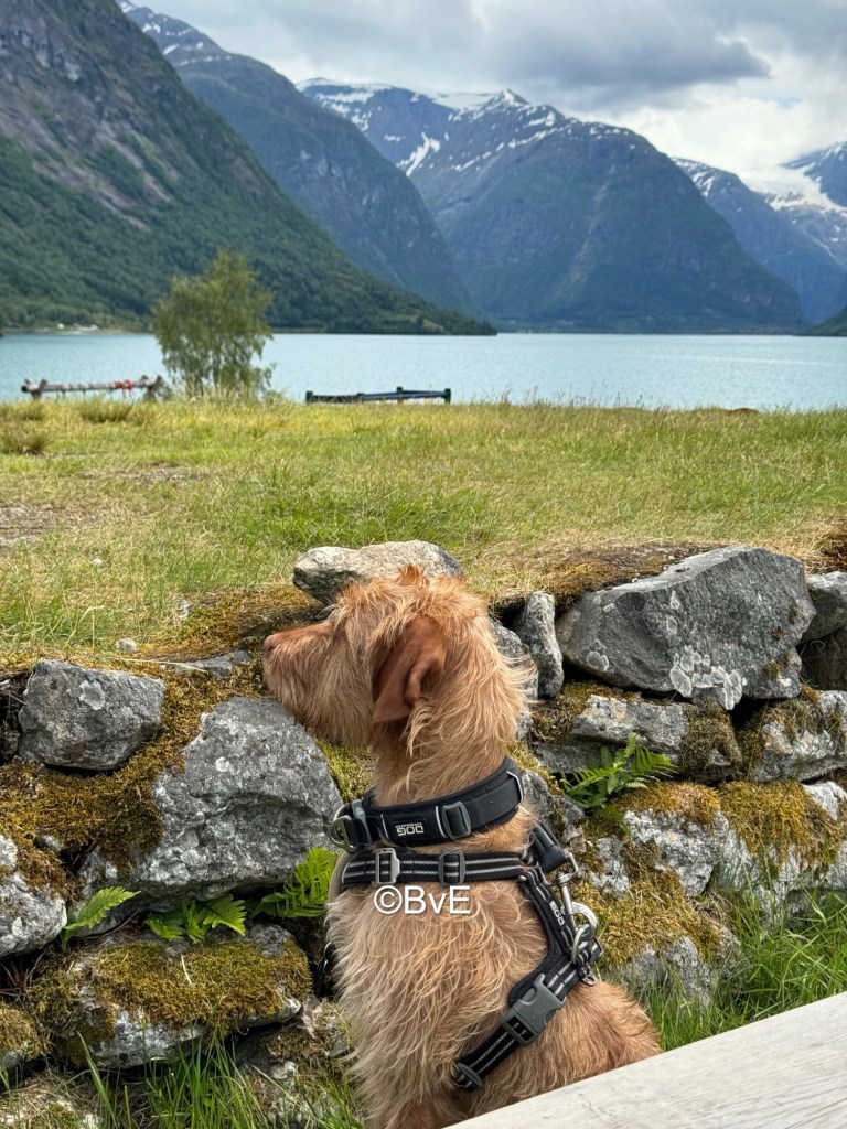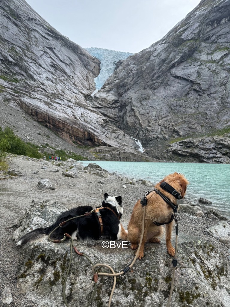 Naar parkeerplaats bij Briksdalsbreen gereden en als één van de eersten aanwezig. Onderweg treffen we een korthaar Vizsla en een groot aantal Nederlanders die niet met hun poten van Pippa af kunnen blijven. Vooral de mannen zijn het ergst: ongevraagd aaien en nog commentaar ook over het wilde gedrag dat daarop ontstaat. Grrr.