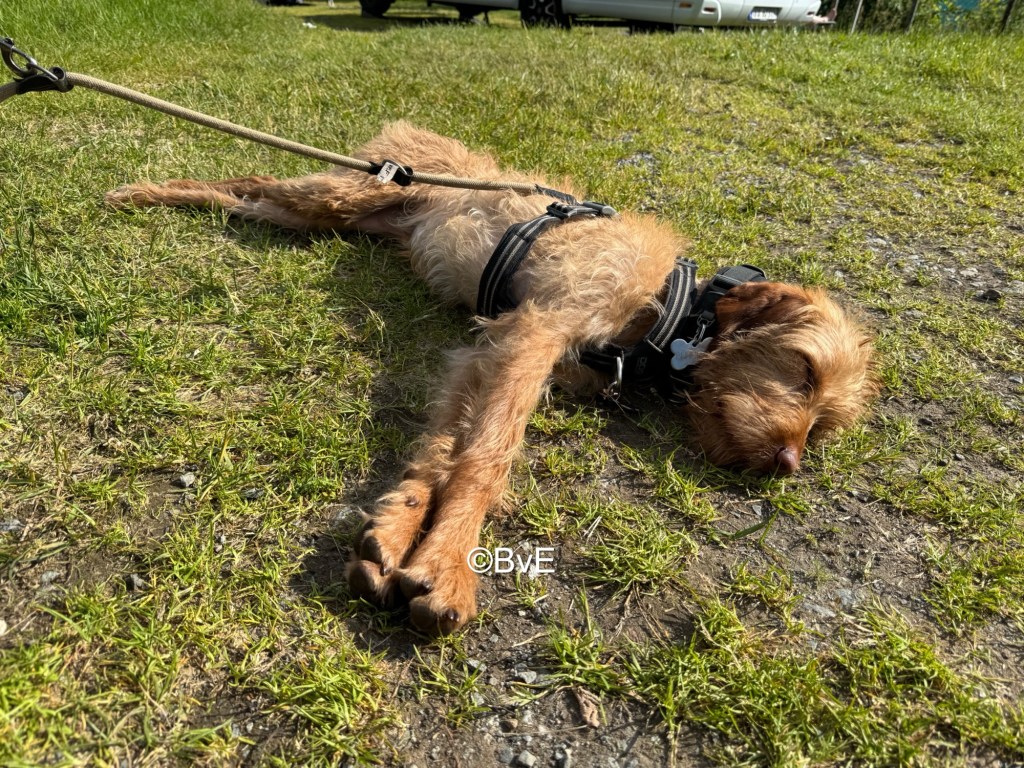 Terug op camping kreeg ik Pippa na het afvangen van de tientallen teken maar niet in slaap: ze worstelde overduidelijk met alle prikkels en een slaapplek op het gras. Op schoot genomen en tada dan is ze onmiddellijk vertrokken naar dromenland. Haar zo een half uur laten pitten en haar daarna op het gras gelegd. Toen gaf ze er wel aan toe.