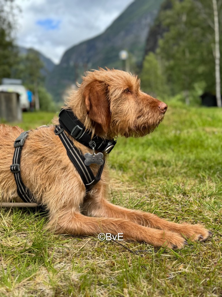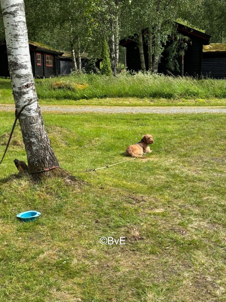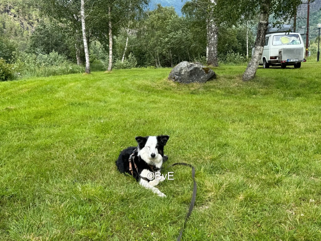 Wel leuk is de sneeuw in Jotunheimen en Pippa blijft rondjes crossen op het gevaarlijke af. We staan namelijk op een verhoogd deel en ik heb weinig zin in een sneeuwdiepte getrokken te worden. Dat was dus even streng zijn helaas. Op de camping konden ze vervolgens heerlijk in de relaxstand. Lekker weer, zonnetje en veel ruimte. Amy slaapt en Pippa houdt de boel goed in de gaten.