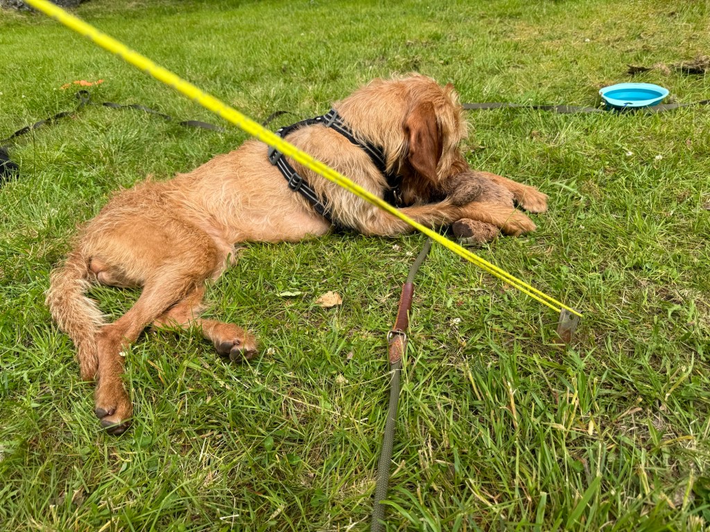 Had graag gemeld dat we zo zeer elegant naar beneden liepen maar helaas: kudde schapen op het pad. Allemaal voorzien van een bel. Amy gaf overduidelijk het signaal Jacht aan Pippa want die werd wild. Heeft normaal helemaal niets met schapen. Schapen konden veiligheidshalve maar 1 kant op en dat was naar beneden. Dussss. Steil gravelpad, Border Collie die schaapjes aangeeft dat ze door moeten sjouwen en een blije Pippa die graag onderdeel wil zijn van dit feest. Blij met mijn goede bergschoenen! Bij het naderen van de brug maakte ik me al zorgen dat we de schapen de brug over zouden drijven richting grote weg maar gelukkig voor ons stonden daar een paar wandelaars dus schapen kozen ander paadje. Oef. Na al dit vermaak honden op rust bij de tent.