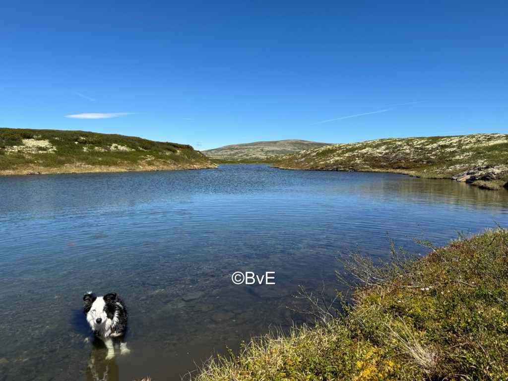 Daarna korte pauze op de camping en vervolgens Rondane weer in voor een wandeling. Op de bonnefooi gelopen; het terrein is toch vlak dus dat rode autootje maar gewoon een beetje in het zicht houden. In een vennetje de honden even lekker laten spartelen en daarna weer terug naar de camping. Daar verplicht in schaduw gelegd vanwege de warmte. Maar Pippa maakt zich toch best wel druk met haar beer om alle nieuwe gasten te verwelkomen. Later in de middag contact met Duits-Engels stel. Die misten hun Jackje zo.. of ze even mochten knuffelen met Pippa en Amy. Mevrouw, van origine Brits, was verrukt dat Amy haar taal verstond. Ik blij dat Amy ook es in de belangstelling staat in plaats van alleen die tarwegele clown.