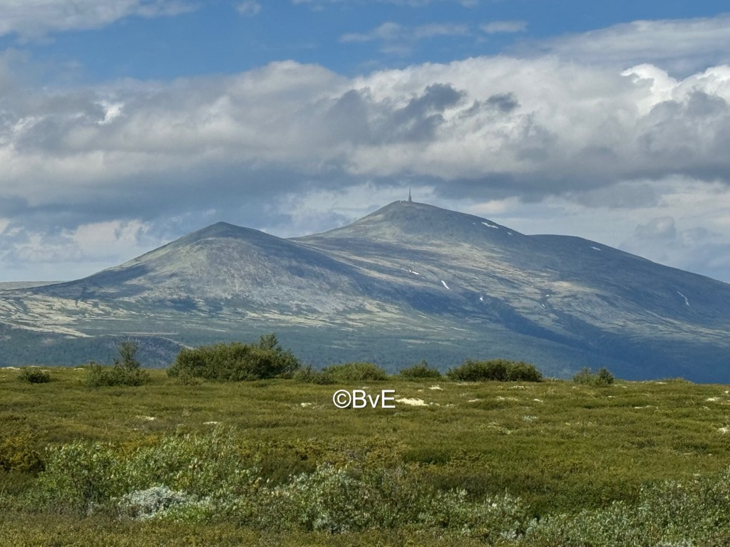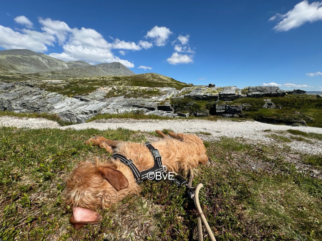Iets later aan de dag begonnen dan de bedoeling was door een lekke band van de auto. ANWB liet zich van haar allerbeste kant zien: binnen twee uur gefixed door Noorse pechdienst. En dat is werkelijk wanzinnig snel voor Noorse begrippen. Dan aan de rol de Rondane weer in: route gekozen naar Peer Gynt hytte. Helemaal alleen met twee honden door dit gebied dwalen vind ik bijzonder gaaf. Sommige stukken waren zeer drassig en daar hadden ze een soort van aanrechtbladen neergelegd: grote platte stukken natuursteen. Halverwege een stuk met balken en planken en nog meer stapstenen. Amy houdt keurig in als ik vertraag, Pippa loopt dan uit voorzorg maar achter. Van de warmte hier niet zo’n last door verkoelend briesje.