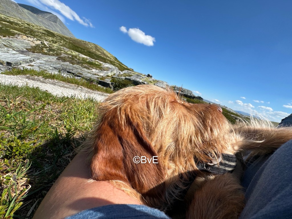 Vlakbij de hytte een riviertje over. Een aardige Noor wachtte op mij om te vragen of hij mij moest helpen. Zeer attent maar niet nodig. Zijn gezelschap ging erg bijzonder het water over maar later zag ik dat ze van die lichte wandelschoenen aan hadden; dat verklaard een hoop. Ik heb zware waterdichte stappers dus zo’n rivier kan gewoon. Amy los gelaten en da’s dus geen goed idee qua Pippa. Die wil er dan in hetzelfde tempo ook achteraan en dat kan niet. Die hond durfde ik niet los te laten omdat die van water altijd de zoomies krijgt en ik wist niet of de groep Noren nog in de buurt was. Zonder enkels te breken overkant bereikt. Misschien toch dat aangeboden handje moeten accepteren. Bij de hytte op pauze en “slapie doen” tegen Pippa gezegd. Die stort daarop ter plekke in mijn armen in een diepe slaap voor een half uur. Blijft bijzonder dat ze dit op commando gewoon doet.
