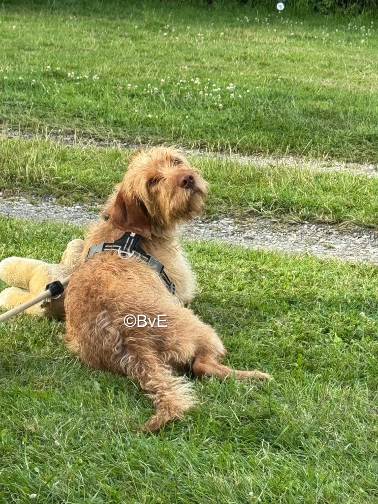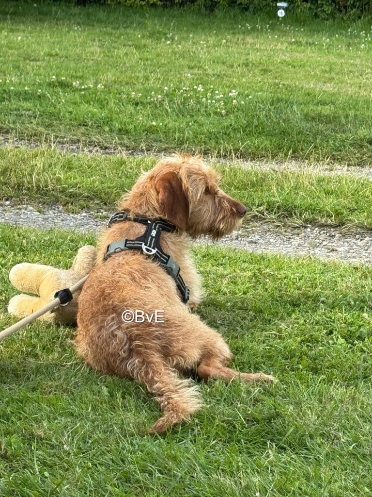 Op deze Deense camping hebben we een topplek aan het pad. Pippa zit met beer op wacht en er is geen ontsnappen aan.