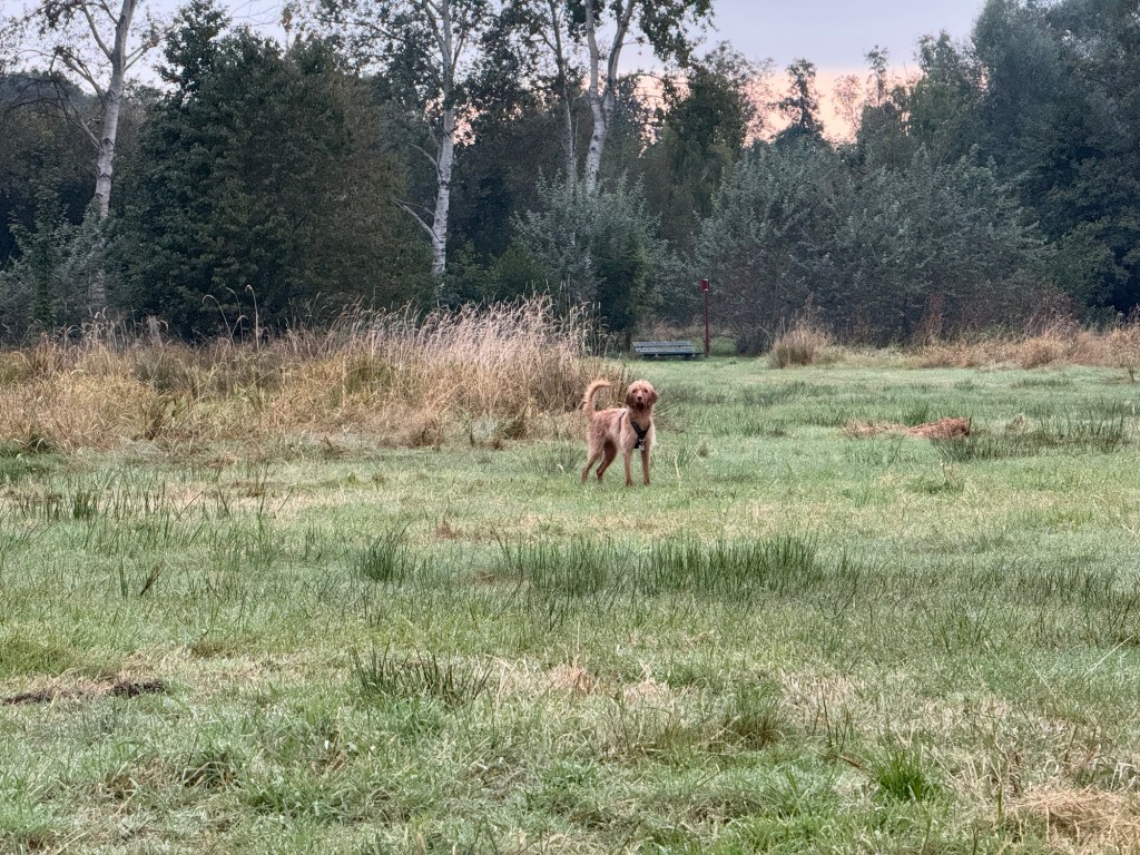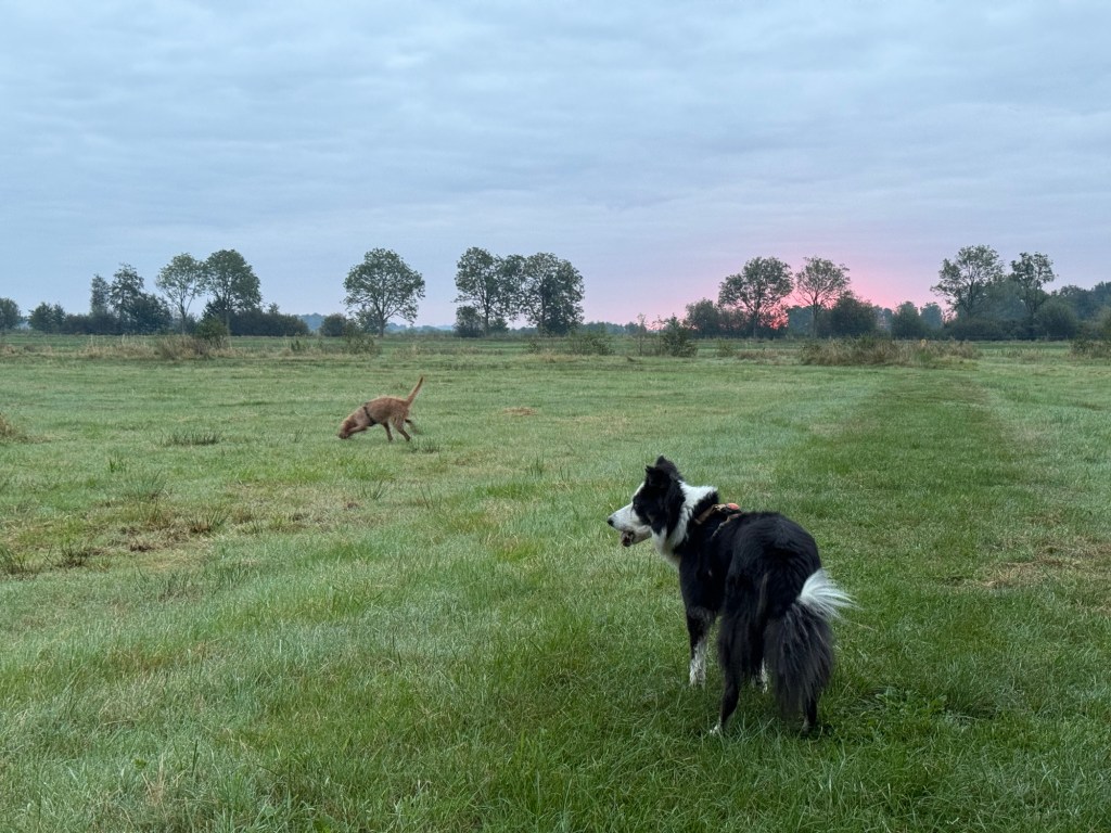 Lekker vroeg op pad in de Nienoord. Op het uitlaatveld is Pippa overduidelijk aan het jagen/speuren. Ze heeft amper tijd om even lekker met Amy te rennen: de neus staat aan.