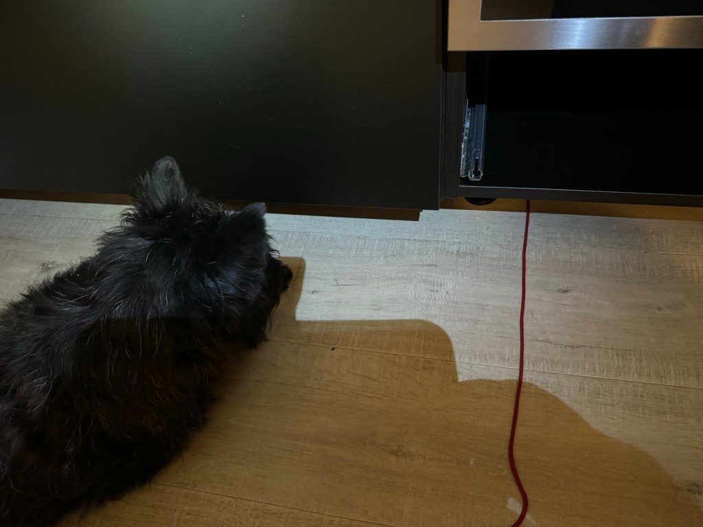 Rebel vermaakte zich prima met kijken bij mijn kluswerk. Vooral het snoer van de oven achter de kastjes langs trekken vond hij bijzonder interessant. In muis-jaag-houding zat hij klaar. Dat doet ie zo overtuigend dat ik toch maar even gekeken heb of er echt niets zat🙈.