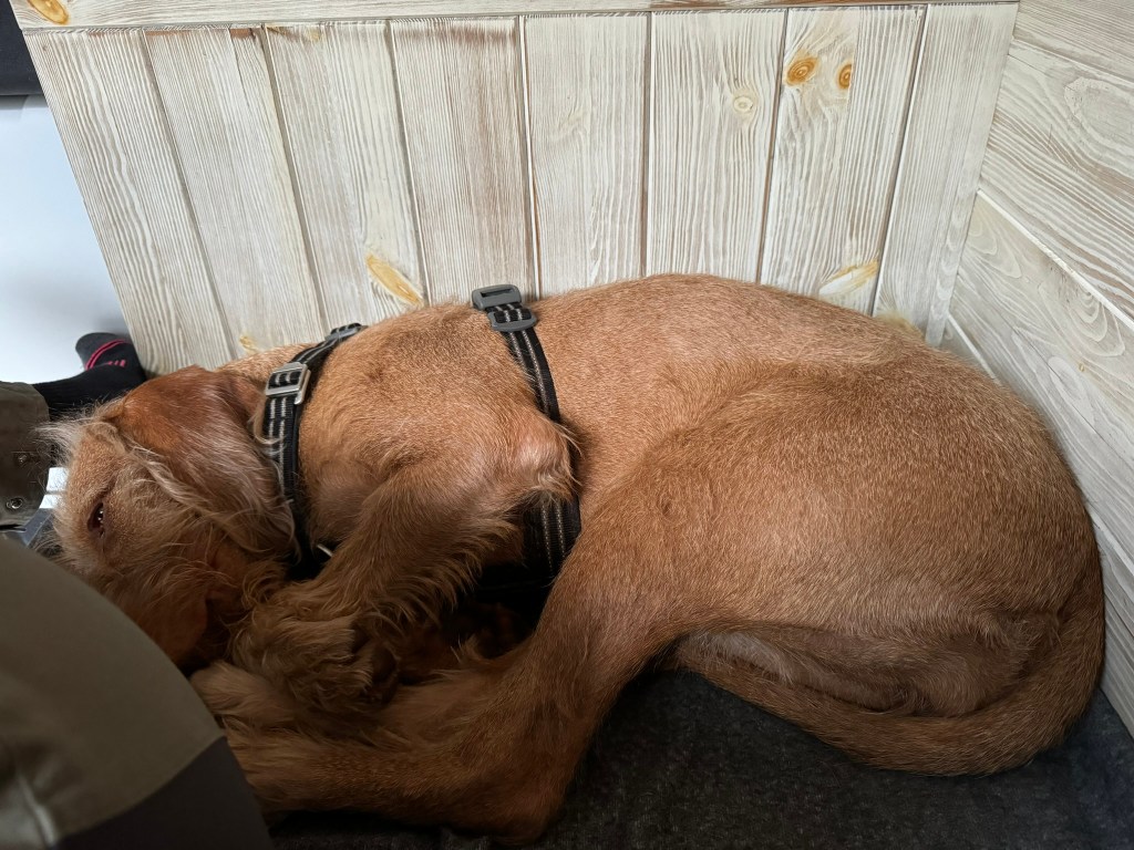 Kom je die kamer in op de vroege ochtend: staat daar een Vizsla eenzelfde dansje te doen als Pippa altijd deed. Huh? Ik begroet iedereen en doe de benchdeur open. Noor begeleid ik gelijk richting voordeur en ze wil vervolgens voor mij uit door de deur sjezen. Dat doen wij hier dus niet…. Noor opgedragen te wachten en dat doet ze dan keurig netjes. Dan pas mag ze naar buiten en ze loopt zich gelijk klem bij de regenpijp die in haar pad staat. We bevinden ons beiden aan een andere kant zeg maar. Ze krijgt het niet zelf voor elkaar zich te ontzetten dus ik help haar een beetje. Plasje doen op het veld naast het huis en weer terug voor dezelfde regenpijpval. Ze krijgt het weer niet zelf opgelost dus maar weer geholpen.