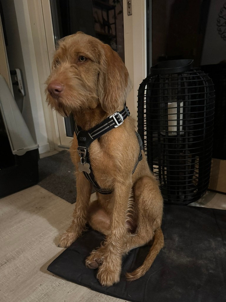 Het leek me vandaag ook wel een goed moment om even samen de winkelstraat door te lopen in het centrum. Dit ging zo goed! Je merkt aan alles dat ze een fijne opvoeding genoten heeft; ze luistert netjes en loopt zo mooi met je mee. Ik heb alle silly-walks vandaag wel uitgeprobeerd en ze is niet van haar stuk te krijgen. Ze wacht als je dat zegt en ze beheerst de Zit goed. Vandaag dan ook maar begonnen met het koppelen van het fluitsignaal aan dat Zit-commando. Het is nu Zit-Fluit-Lekkers.
