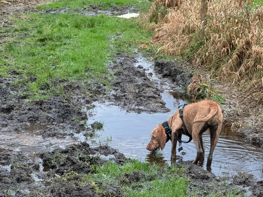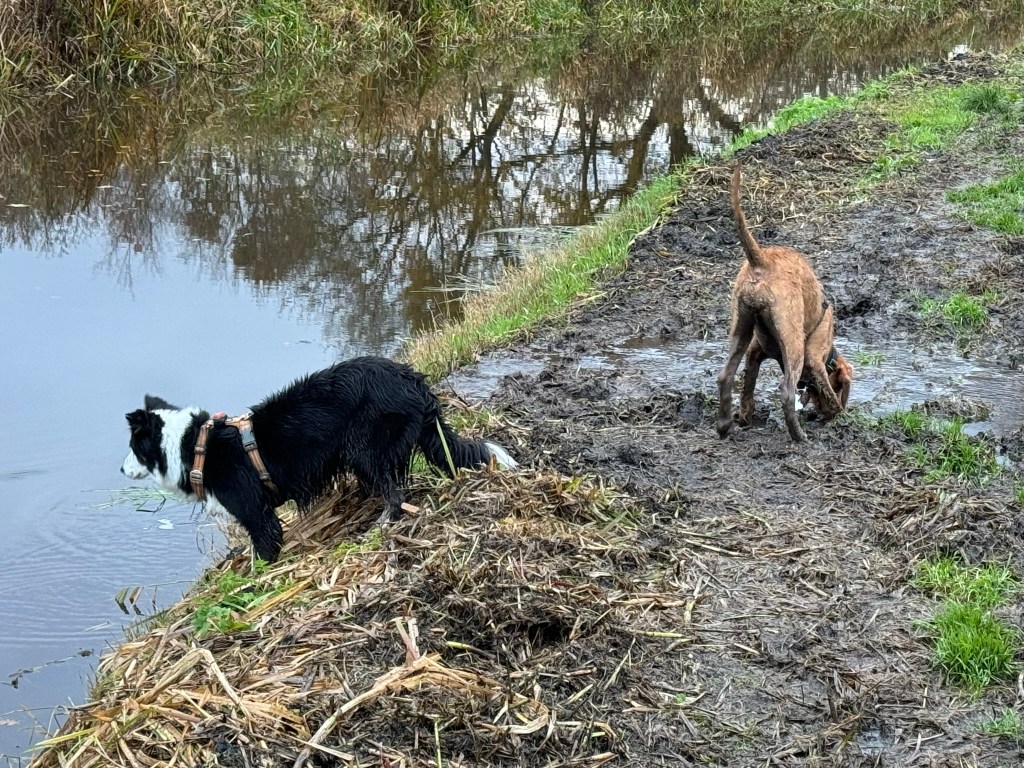 Gelijk maar het bospad genomen en Noor ook losgeklikt. Ze doet eerst wat gek met Amy en gaat dan haar eigen snuffelwerk doen. Ze liep promp een sloot bedekt met veel groen in maar volgens mij was het niet echt haar bedoeling om een nat pak te halen. En het ruikt ook zo fris… maar ik heb niet hardop gelachen om dit ongelukje. Bij het diep aangekomen Amy direct verboden om te zwemmen. Geen idee wat Noor dan namelijk doet en om nou een hond uit de hoofdvaart te gaan vissen is niet mijn hobby.