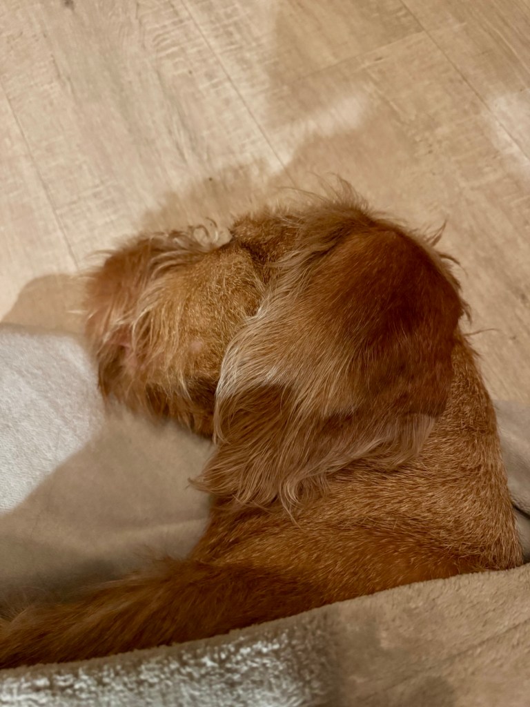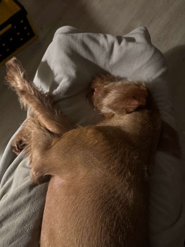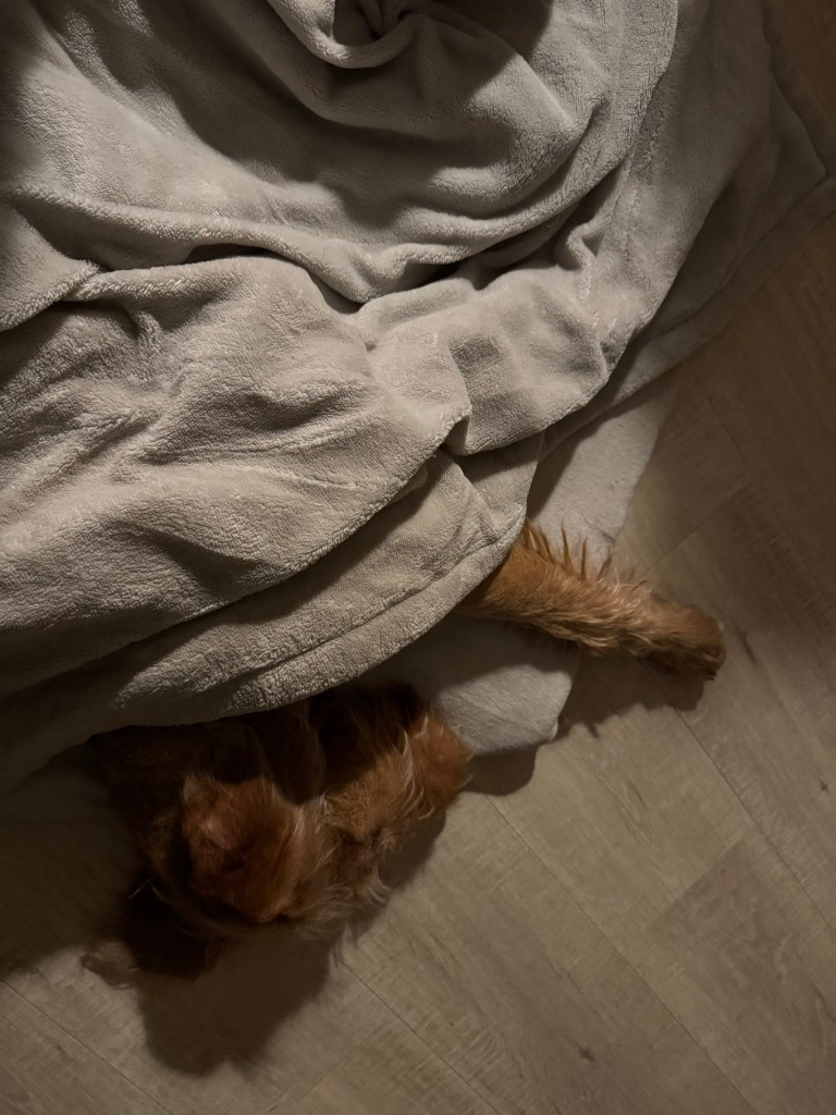 Voordeel van zo’n rondje is dat het koppie ook zo lekker moe wordt.. Na het gebruikelijke avondritueel van Amy uitdagen wil ze maar wat graag languit op schoot liggen slapen. Vanavond zo ver weg in dromenland dat ik haar van schoot kon schuiven en ze op de grond verder sliep. Niet wakker te krijgen voor het laatste ommetje van de dag dus zonder haar vertrokken. En dan kom je terug en vind je een zielig kijkend hondje in de gang. Met mijn fleecedeken, dat dan weer wel. Nog maar weer een rondje dan…