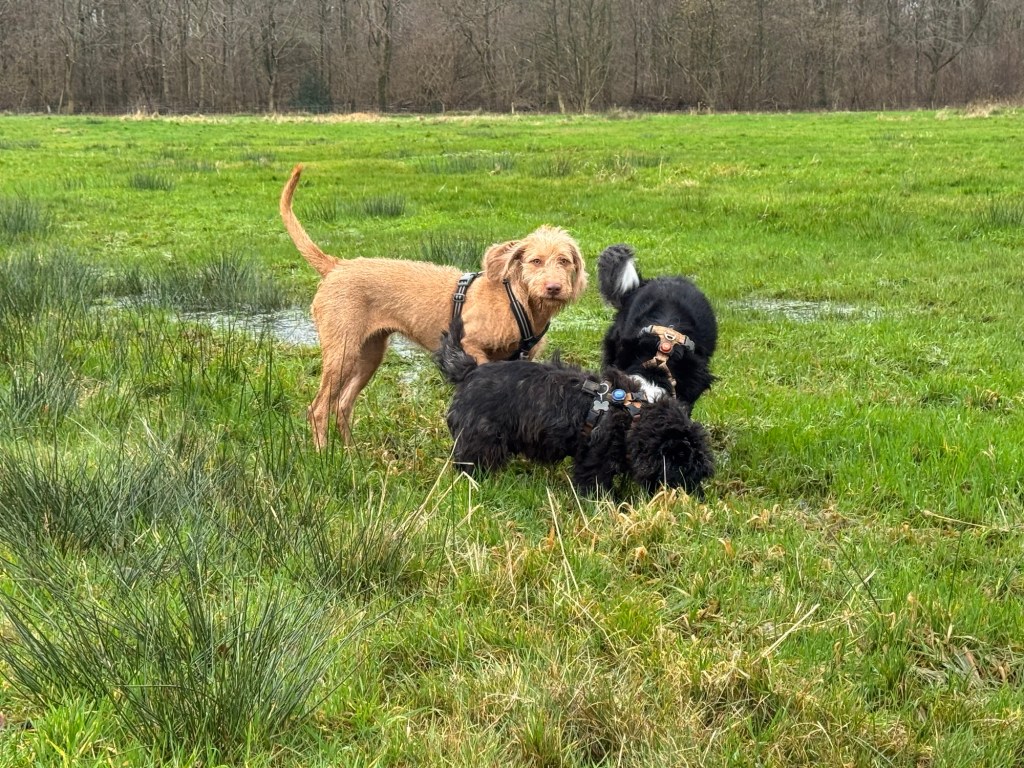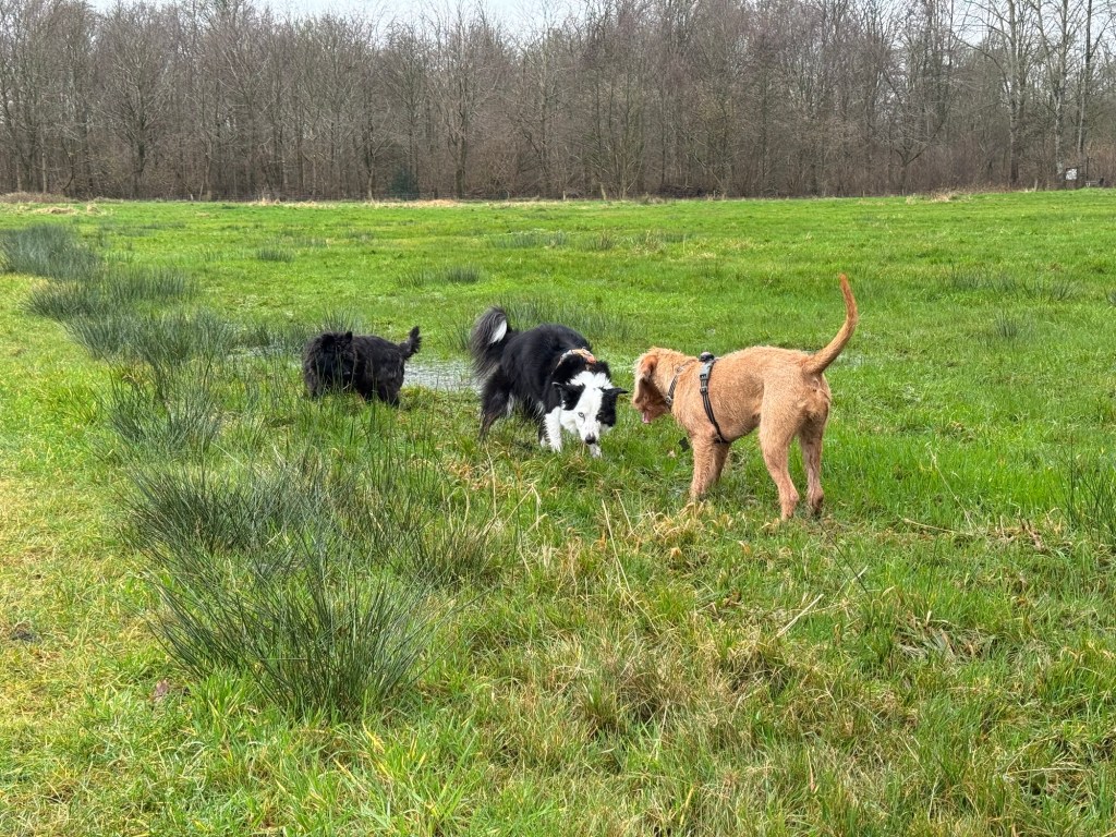 Bij de middagwandeling wordt ik beetje overrompeld door een gehandicapte dame die bijna op Noor duikt met de opmerking: aaien mag wel even hè? Ik schiet er gelijk tussen met been en half bovenlijf met Ho! Dat kan niet! Op hetzelfde moment is daar ook een brave Border Collie tante.. Amy duikt met haar kop tegen de graaiende handen van mevrouw. Niet om aandacht te vragen maar om mee te doen met mijn afschermaktie. (Waarschijnlijk was ze er sneller dan ik me zelf realiseerde.) Mevrouw start met knuffelen van Amy maar die houdt daar totaal niet van en laat mevrouw nu aan mij over. Weg naar de voorhoede.